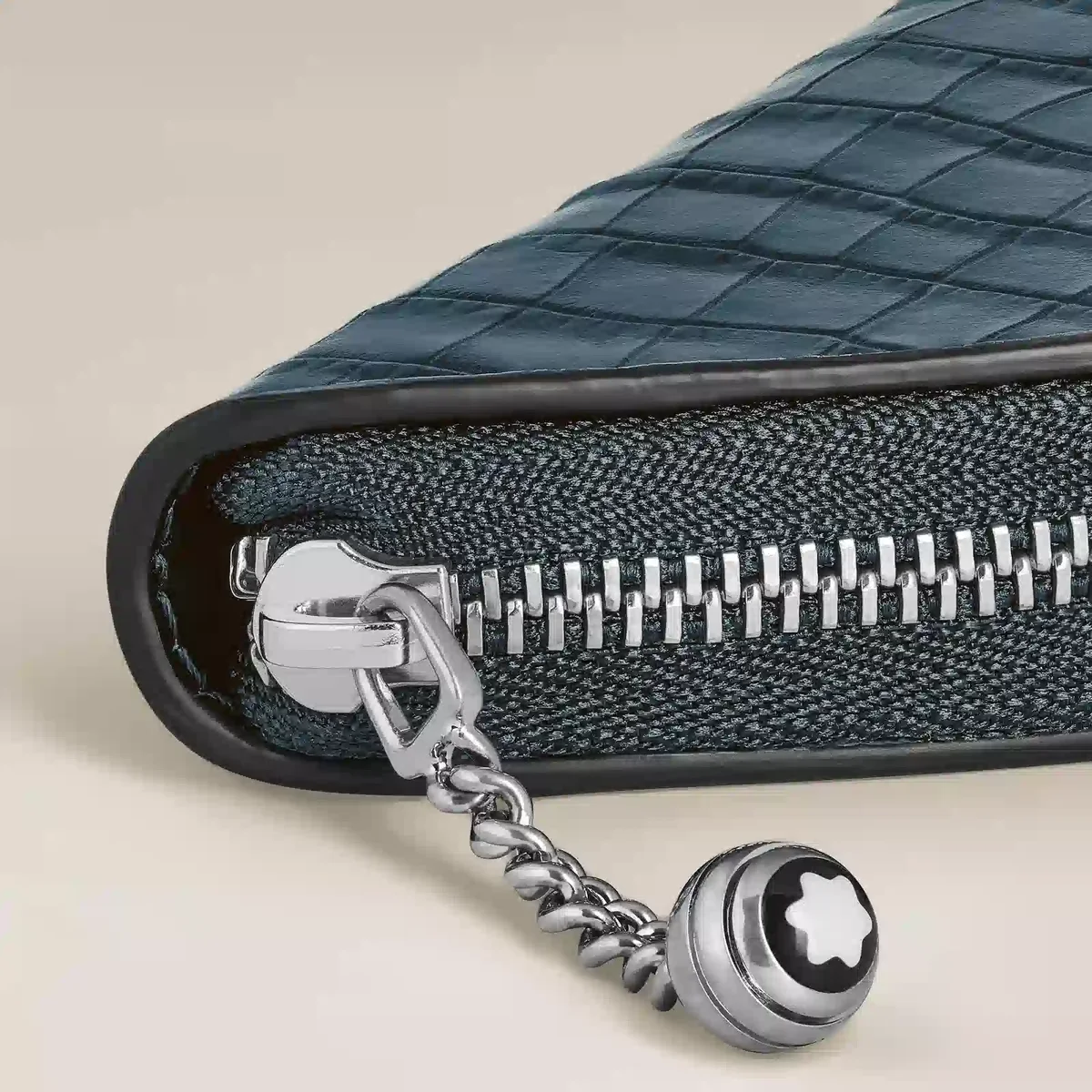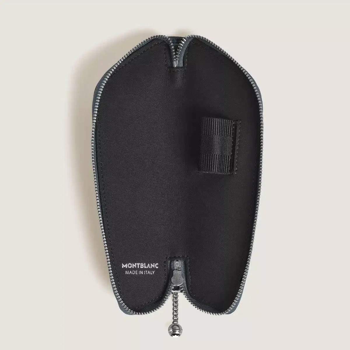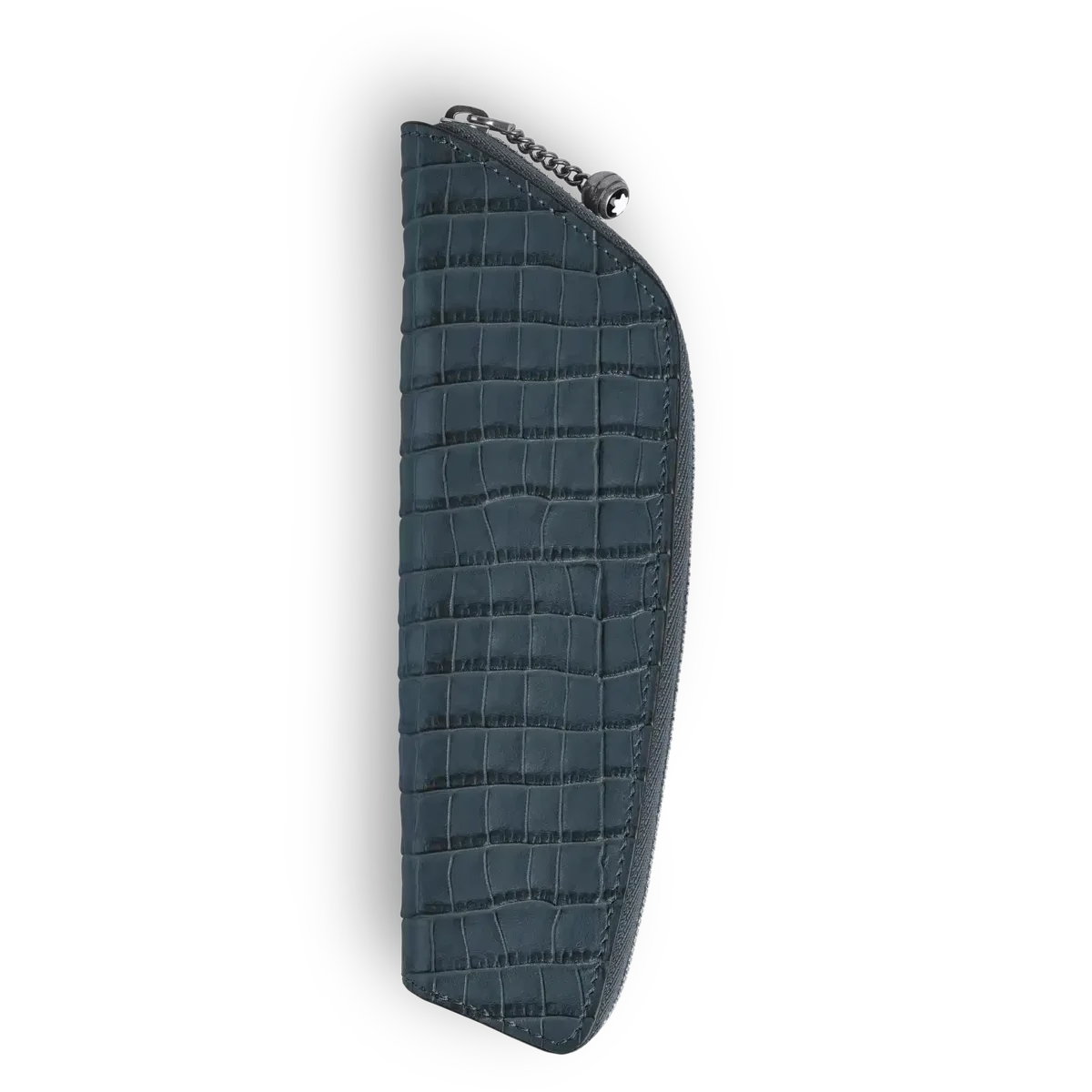 A bolsa para canetas celebra o legado da Montblanc com um toque moderno. Confeccionada em couro azul aveludado com relevo croco, apresenta o puxador de zíper com corrente e emblema esférico, inspirado numa bolsa para canetas Montblanc de arquivo, uma das primeiras criações em couro da marca. Concebida para guardar um instrumento de escrita, como a Meisterstück Classique ou a LeGrand, esta bolsa elegante combina um estilo distinto com a praticidade do dia a dia.
