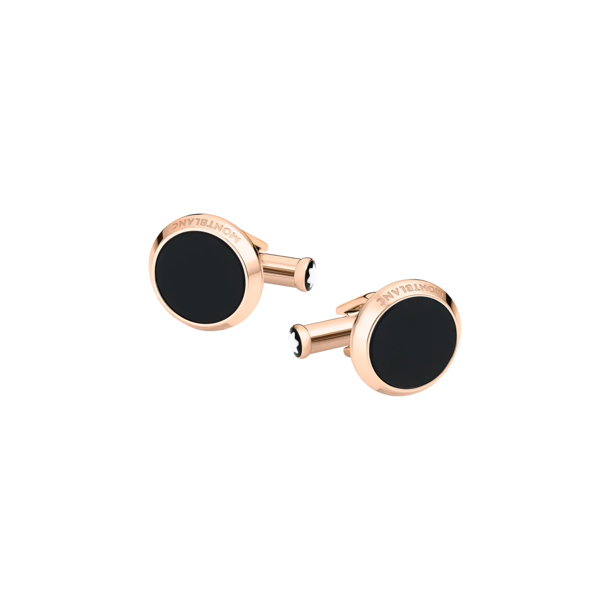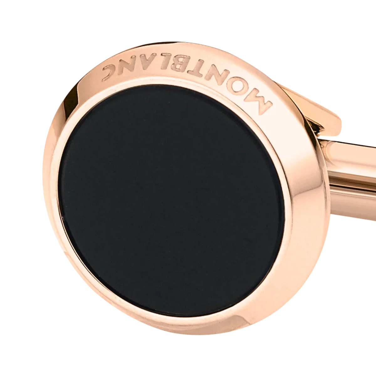 Os botões de punho Meisterstück celebram um estilo intemporal. Associados ao instrumento de escrita Montblanc Meisterstück, a forma redonda intemporal em aço inoxidável com acabamento PVD em ouro rosa e incrustações de ônix cria uma joia com a poderosa assinatura Montblanc.