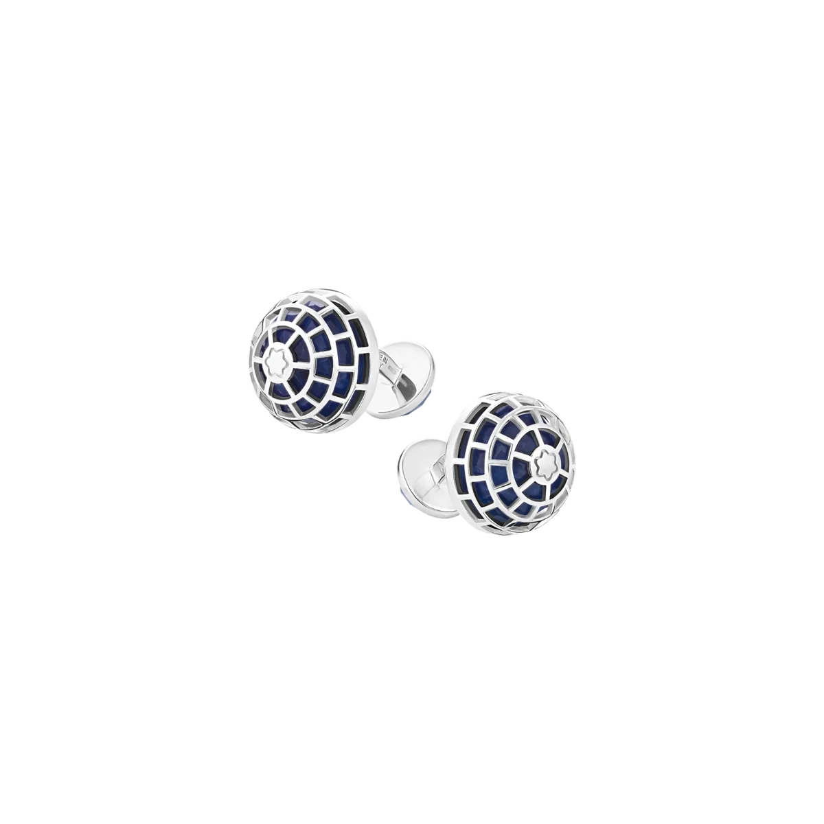 Estes botões de punho Montblanc Meisterstück são feitos de prata com uma pedra sodalita azul encerrada numa forma abaulada contemporânea e complementada pelo emblemático emblema Montblanc gravado. A parte de trás da peça também é decorada com uma pedra sodalita redonda.