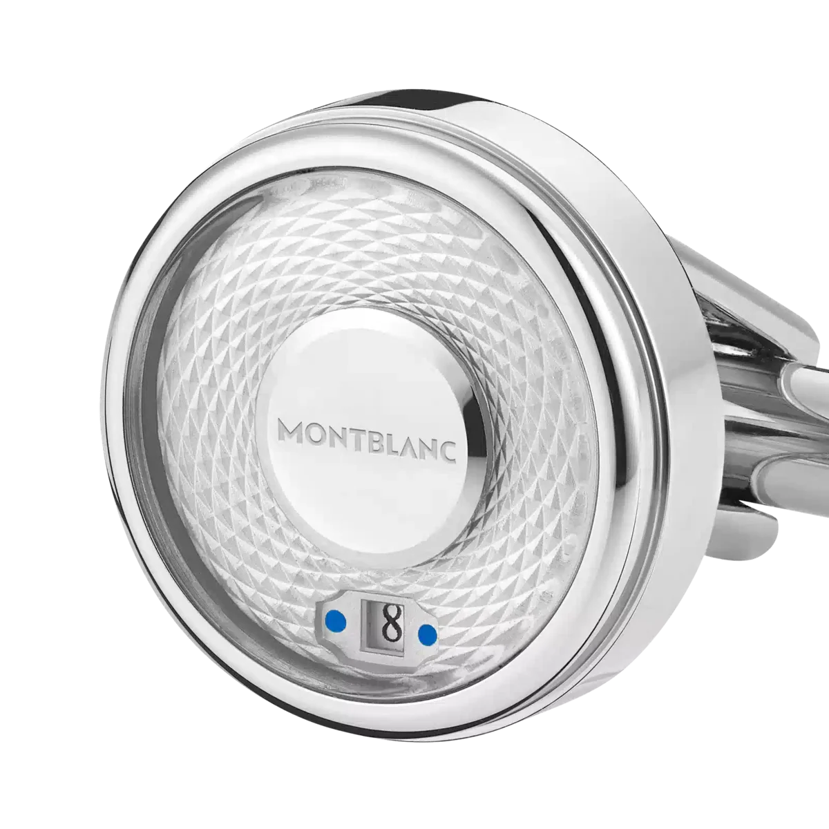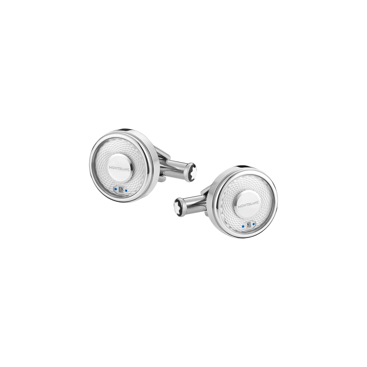 Estes botões de punho prestam homenagem ao design do relógio Montblanc Star Legacy Nicolas Rieussec Chronograph. A placa central em aço inoxidável é decorada com um padrão guilhochado gravado e o nome da marca Montblanc, enquanto a função de data é exibida através da rotação do anel exterior em torno da placa central.