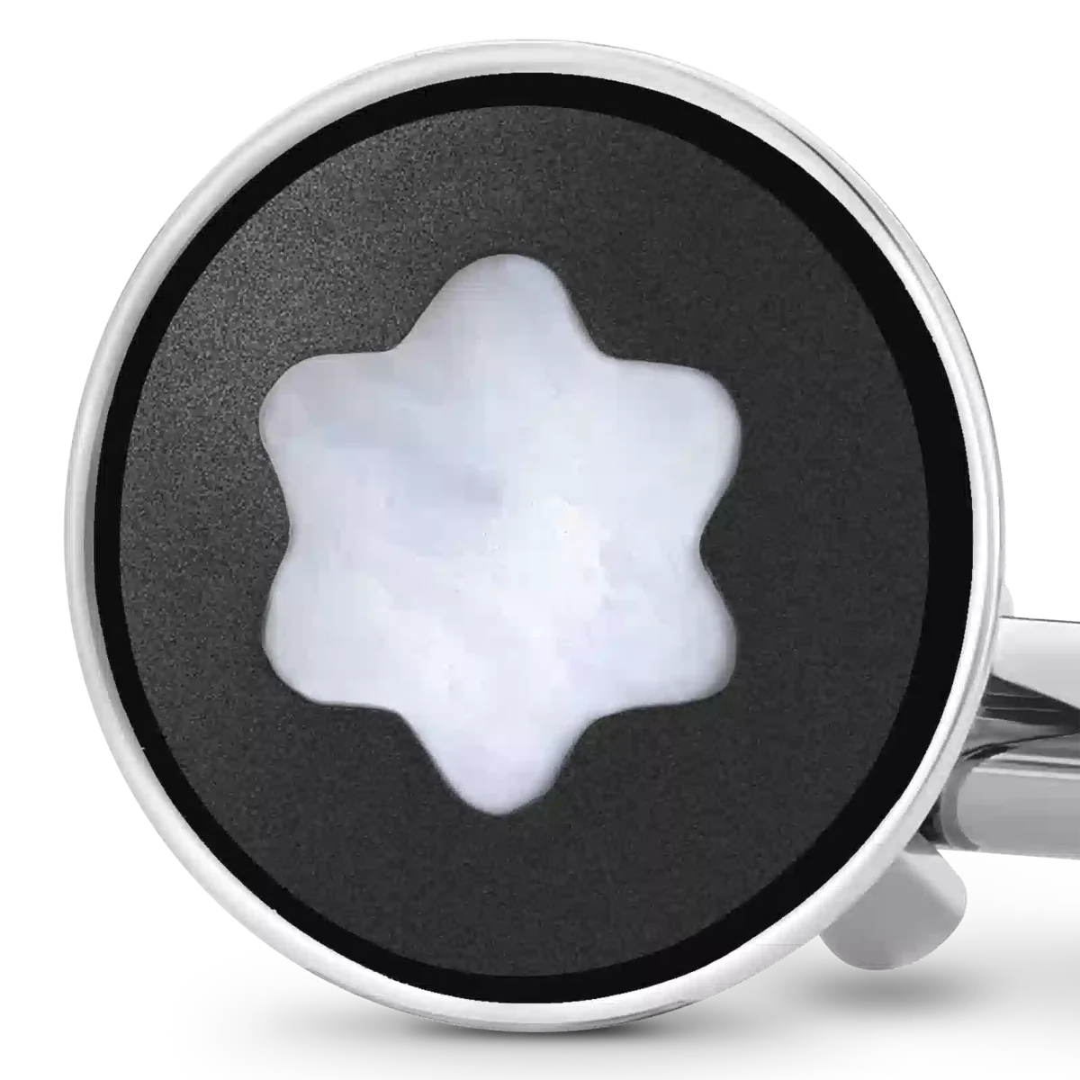 Os botões de punho redondos Montblanc Star em aço inoxidável com incrustação em PVD preto e emblema em madrepérola com neve são inspirados nos códigos da Maison. Uma coleção que apresenta o emblema Montblanc em diferentes interpretações.