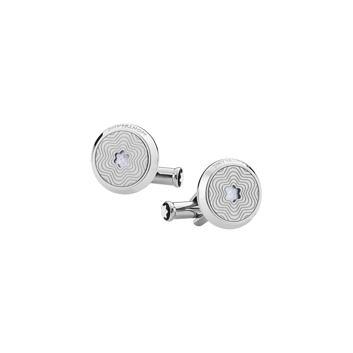 Os botões de punho redondos Montblanc Star em aço inoxidável com padrão de estrela explosiva e emblema de neve em madrepérola são inspirados nos códigos da Maison. Uma coleção que apresenta o emblema Montblanc em diferentes interpretações.
