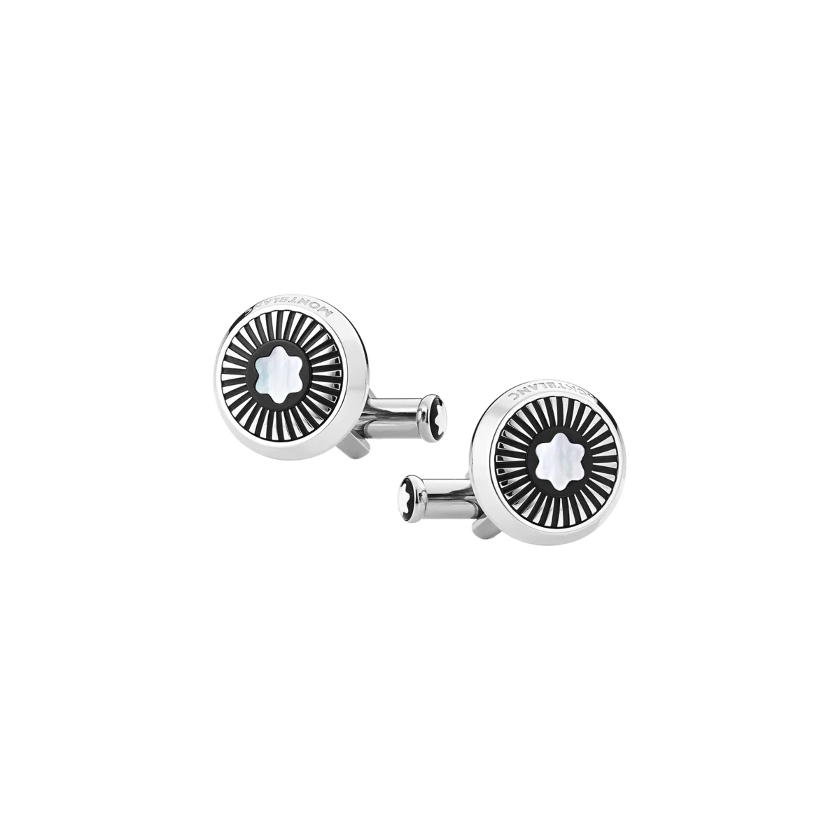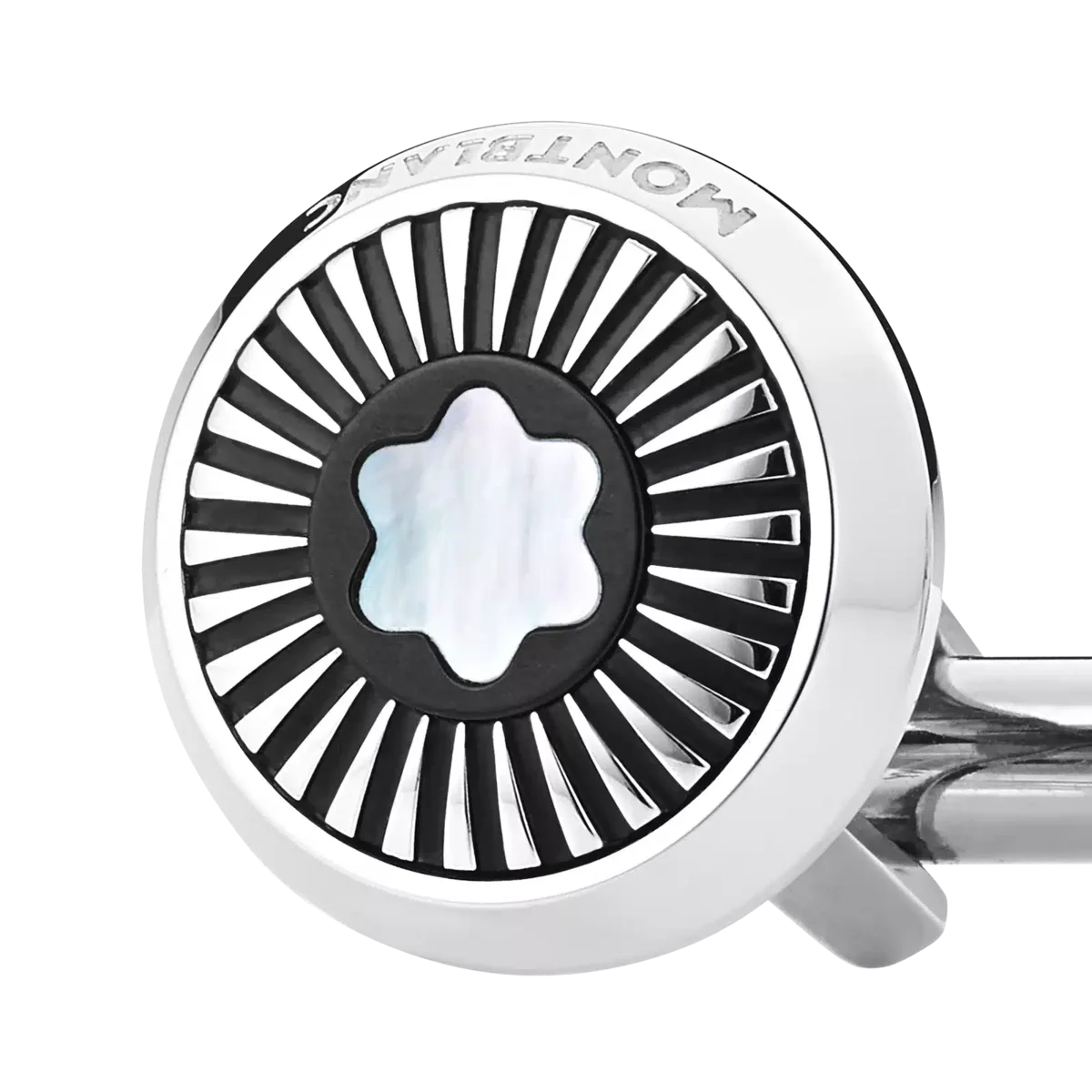 Os botões de punho redondos Montblanc Star em aço inoxidável com padrão de raios e emblema de neve em madrepérola são inspirados nos códigos da Maison. Uma coleção que apresenta o emblema Montblanc em diferentes interpretações.