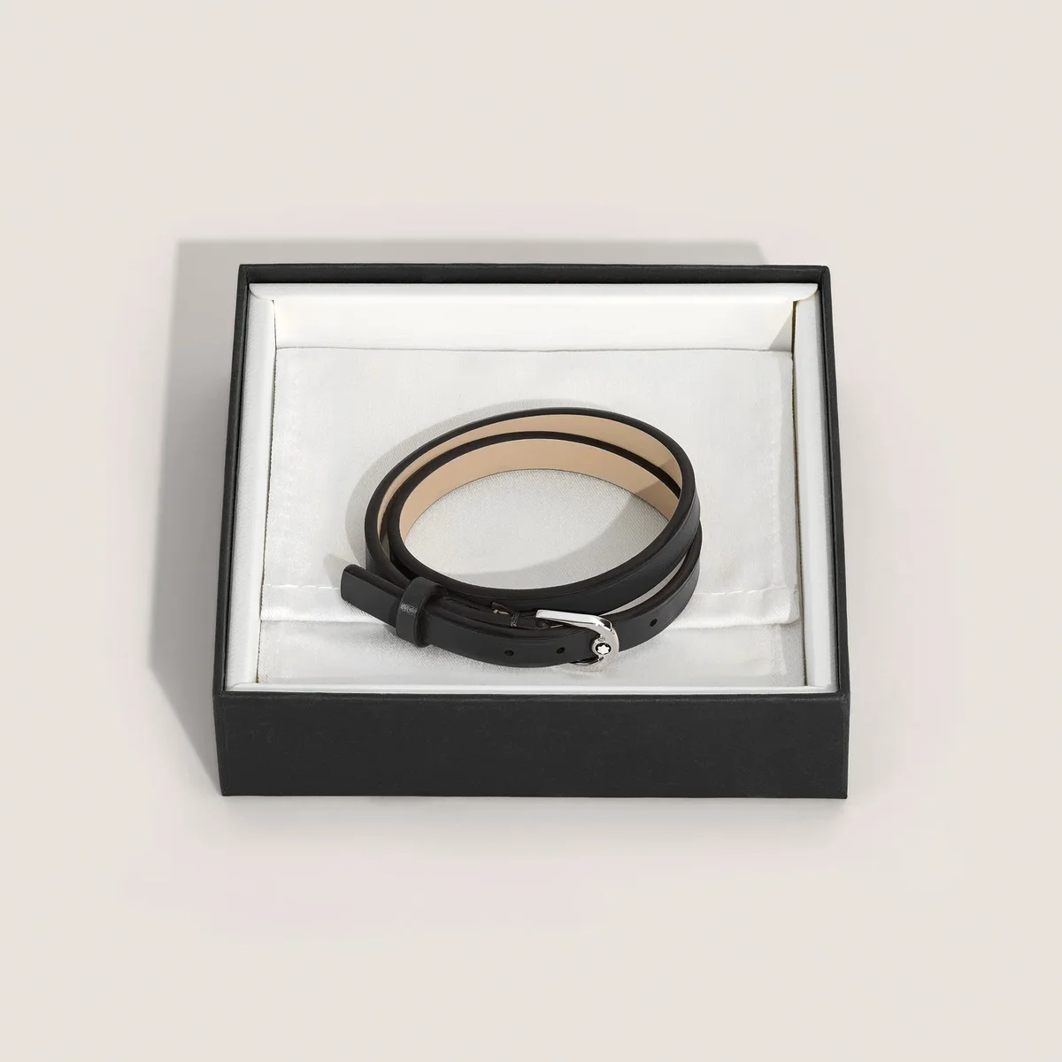 Esta requintada peça de joalharia inspira-se na elegância de um cinto finamente trabalhado, combinando na perfeição funcionalidade e beleza para o adornar com um toque de sofisticação intemporal. A pulseira tem uma bracelete em pele preta e fecho em aço inoxidável. O tamanho é ajustável.