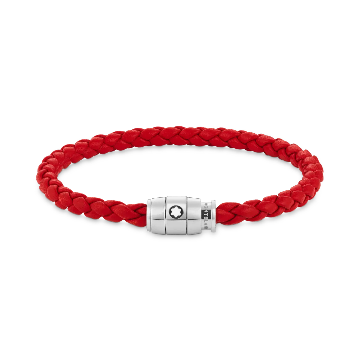 A peça de joalharia, tecida em couro vermelho, tem um fecho em aço inoxidável polido com um anel em aço com o emblema Montblanc.