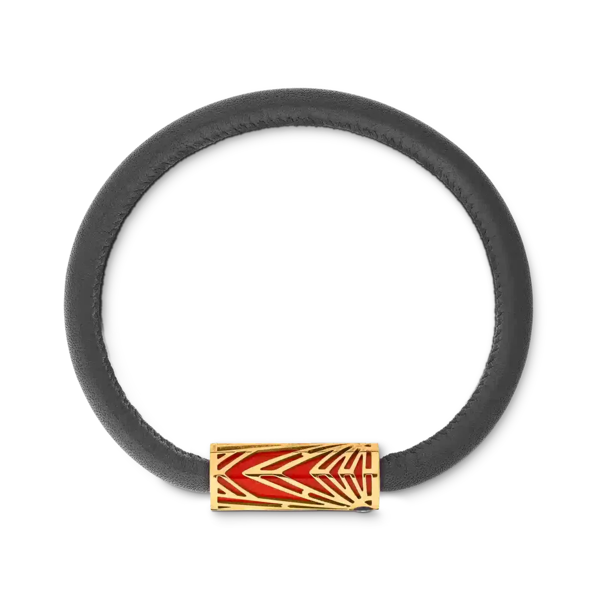 A peça de joalharia tem uma pulseira em couro preto e um tubo em aço inoxidável com revestimento PVD e laca coral (tamanho 63). É inspirada no padrão Solitaire do arquivo.