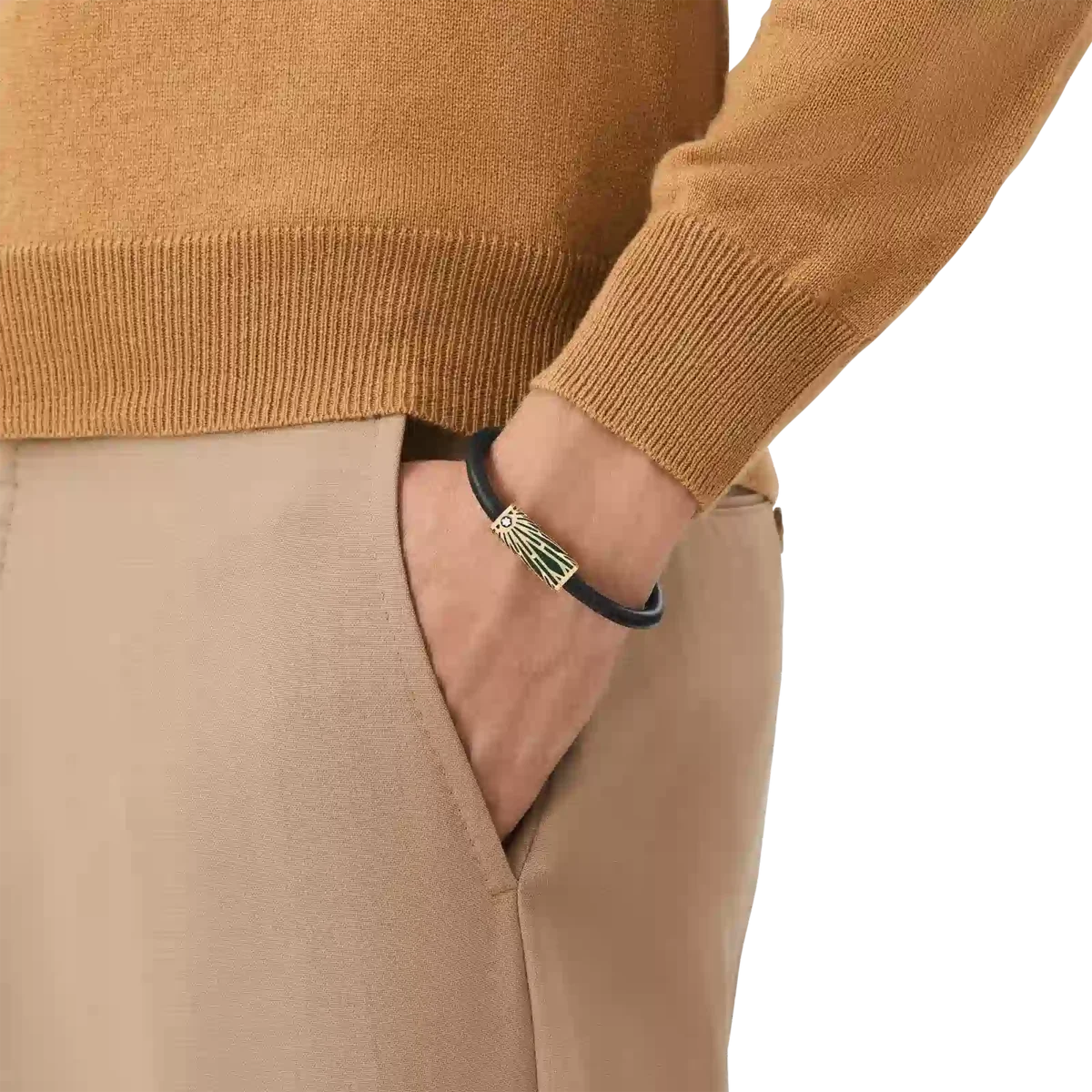 A peça de joalharia tem uma pulseira em pele preta e um tubo em aço inoxidável com revestimento PVD e laca verde (tamanho 60). É inspirada no padrão Solitaire do arquivo.