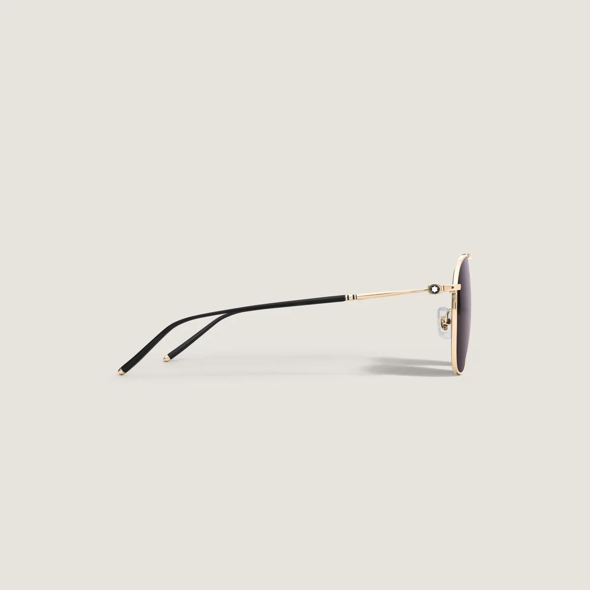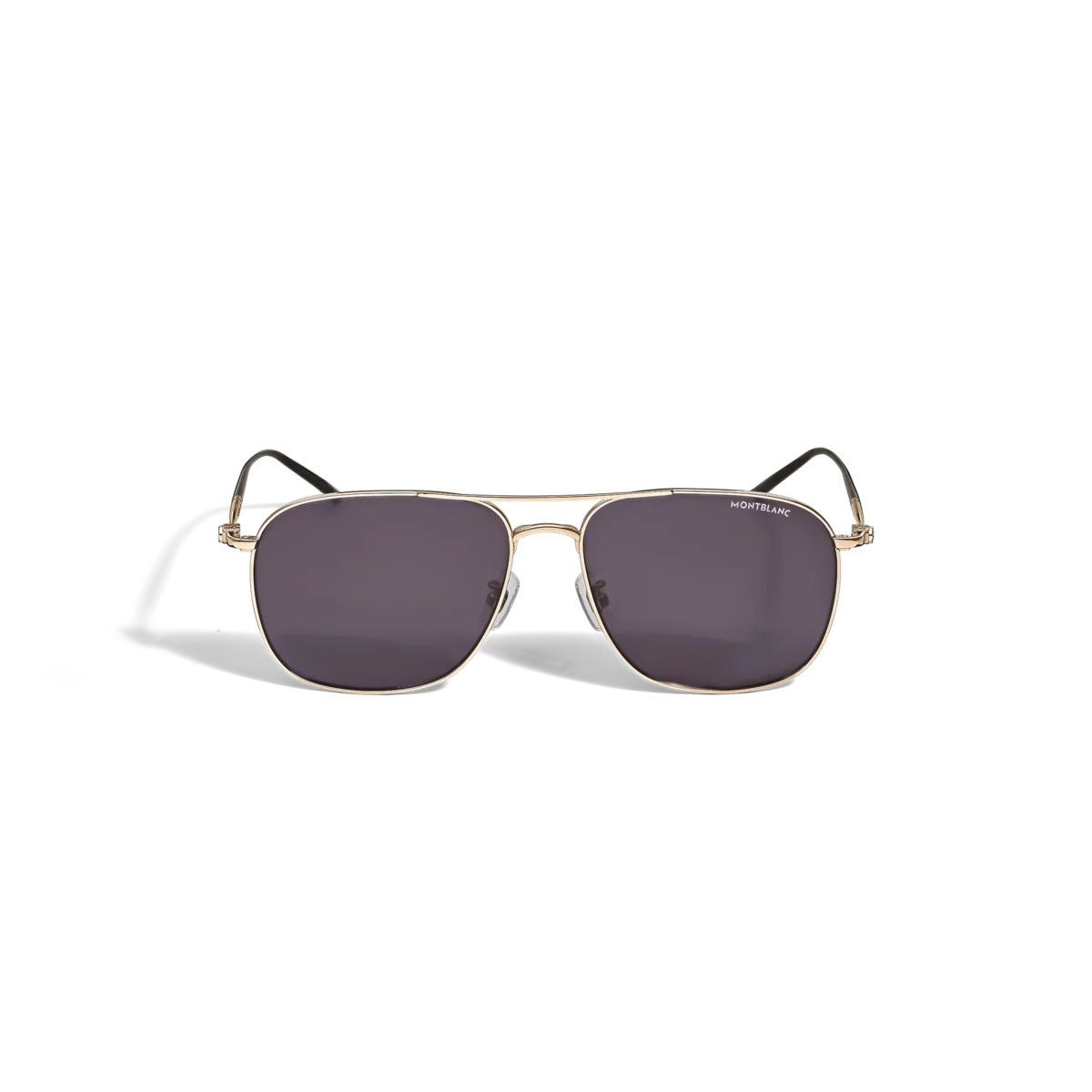Estes óculos de sol de estilo quadrado têm uma armação em metal dourado e lentes cinzentas. Apresentam uma ponte dupla em metal na parte frontal. A haste tubular inspirada nos instrumentos de escrita Meisterstück é enriquecida com um detalhe de 3 anéis. O logótipo Montblanc está gravado a laser na lente esquerda e um detalhe em esmalte preto está encapsulado nas pontas das hastes.