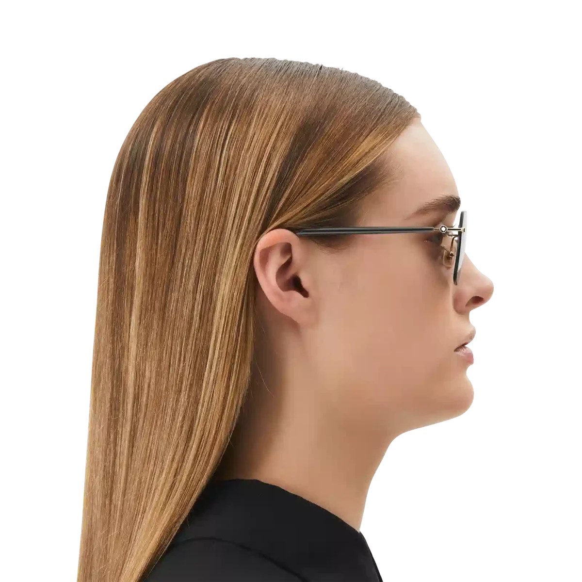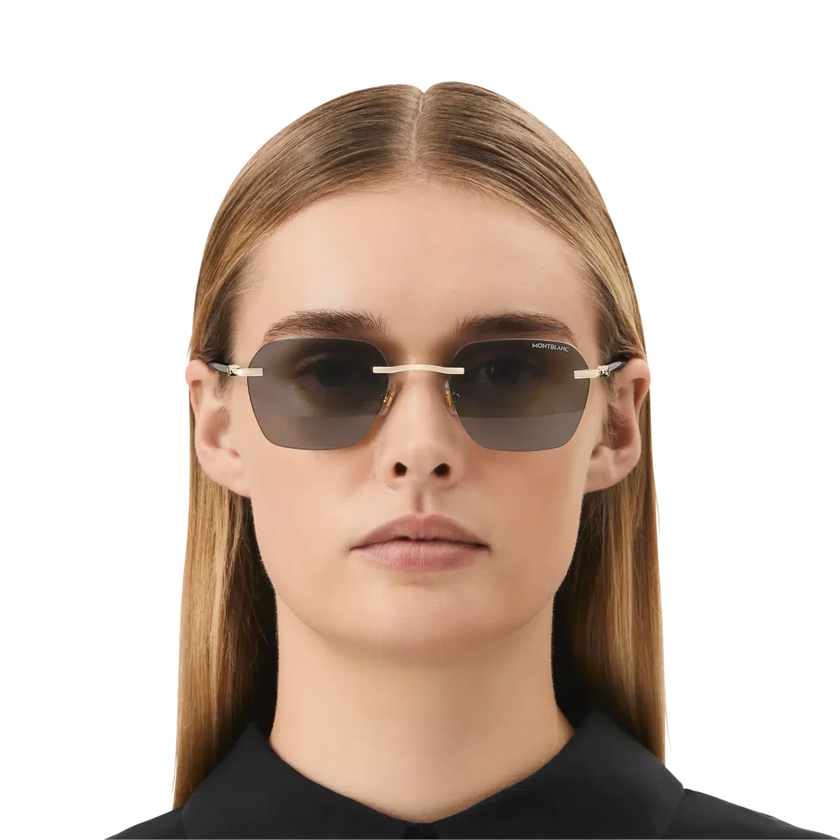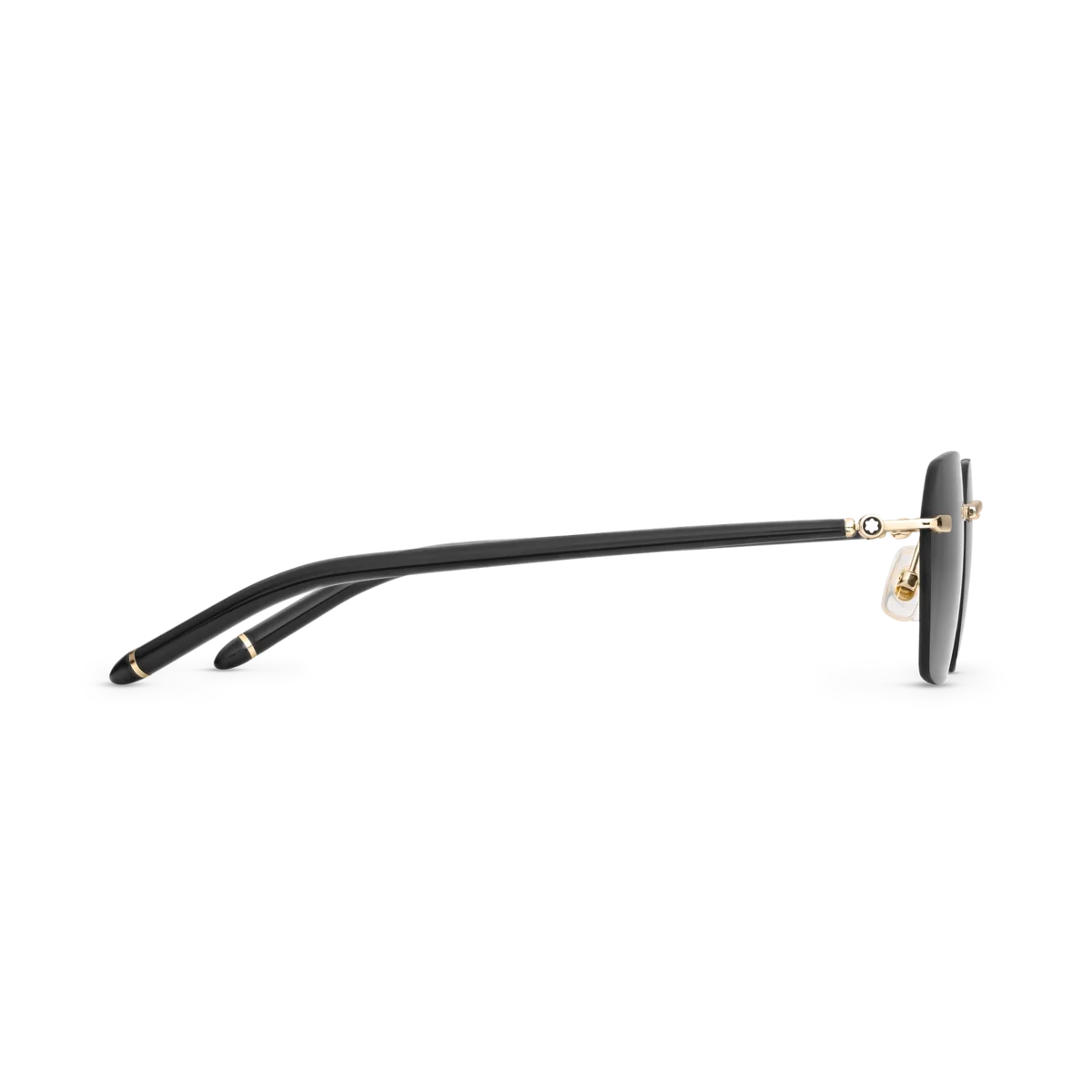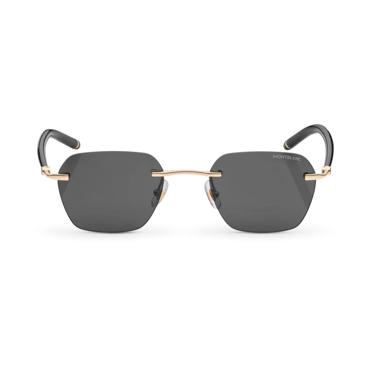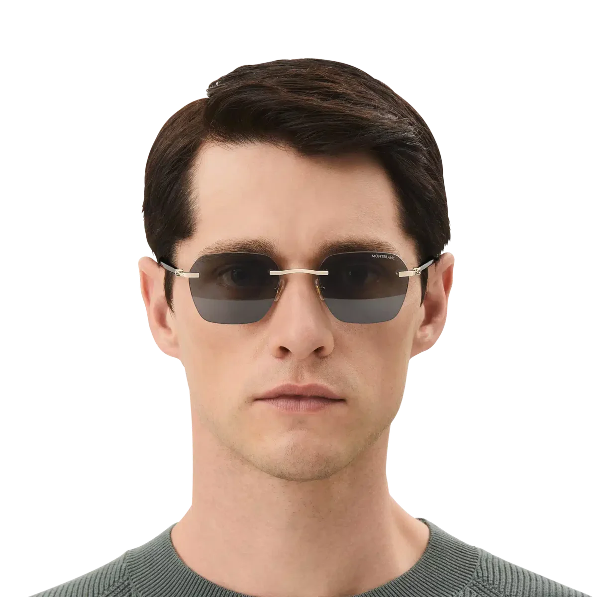 Estes óculos de sol leves, sem aro e de estilo quadrado, têm uma armação em metal dourado e lentes cinzentas. A haste tubular inspirada nos instrumentos de escrita Meisterstück é enriquecida com um detalhe de três anéis. O logótipo Montblanc está gravado a laser na lente esquerda e o logótipo snowcap está encapsulado na haste. O padrão antiderrapante está gravado a laser no lado interno das pontas das hastes para aumentar o conforto.