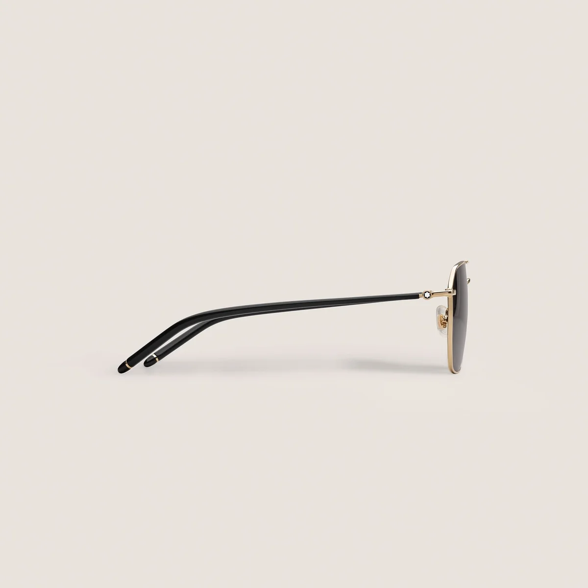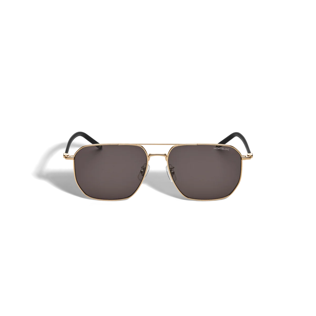 Estes óculos de sol de estilo quadrado têm uma armação metálica dourada e lentes cinzentas. Apresentam uma ponte metálica dupla na parte frontal. A haste tubular inspirada nos instrumentos de escrita Meisterstück é enriquecida com um detalhe de 3 anéis. O logótipo Montblanc está gravado a laser na lente esquerda e um detalhe em esmalte preto está encapsulado nas pontas das hastes. Identificação n.º MB134414