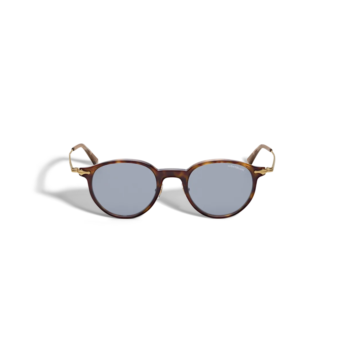 Estes óculos de sol redondos têm uma armação em acetato cor de Havana e lentes azuis claras. Inspirados no design da ponta dos instrumentos de escrita, apresentam um detalhe decorativo na ponta das hastes metálicas. O logótipo Montblanc está gravado a laser na lente esquerda e o padrão antiderrapante está gravado a laser no lado interno das pontas das hastes para aumentar o conforto.
