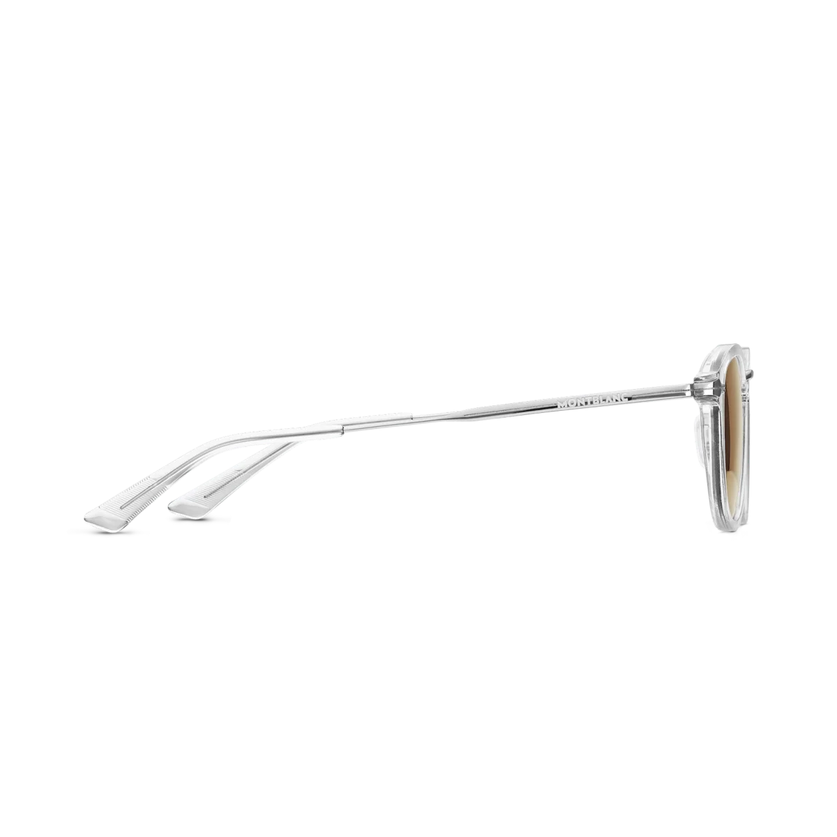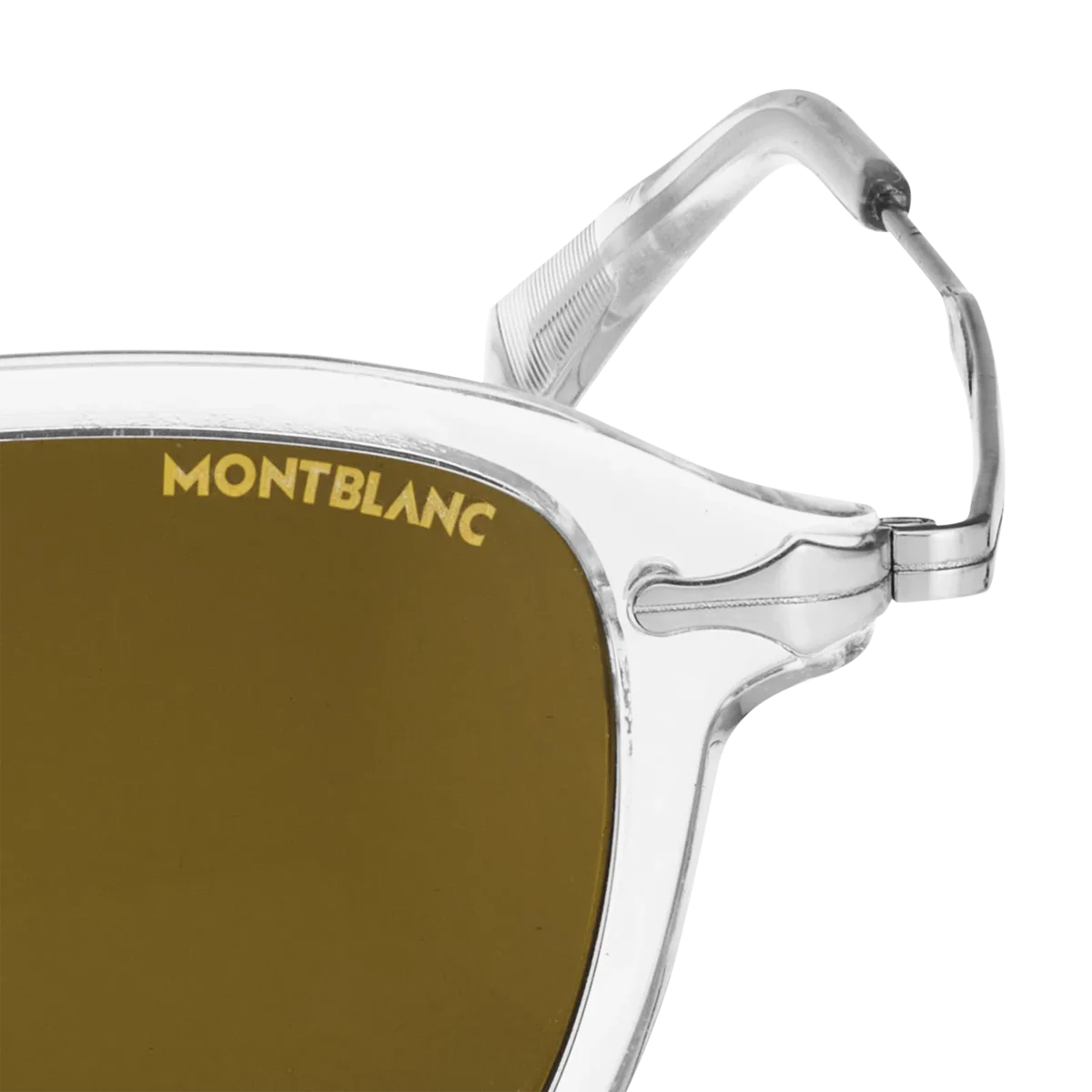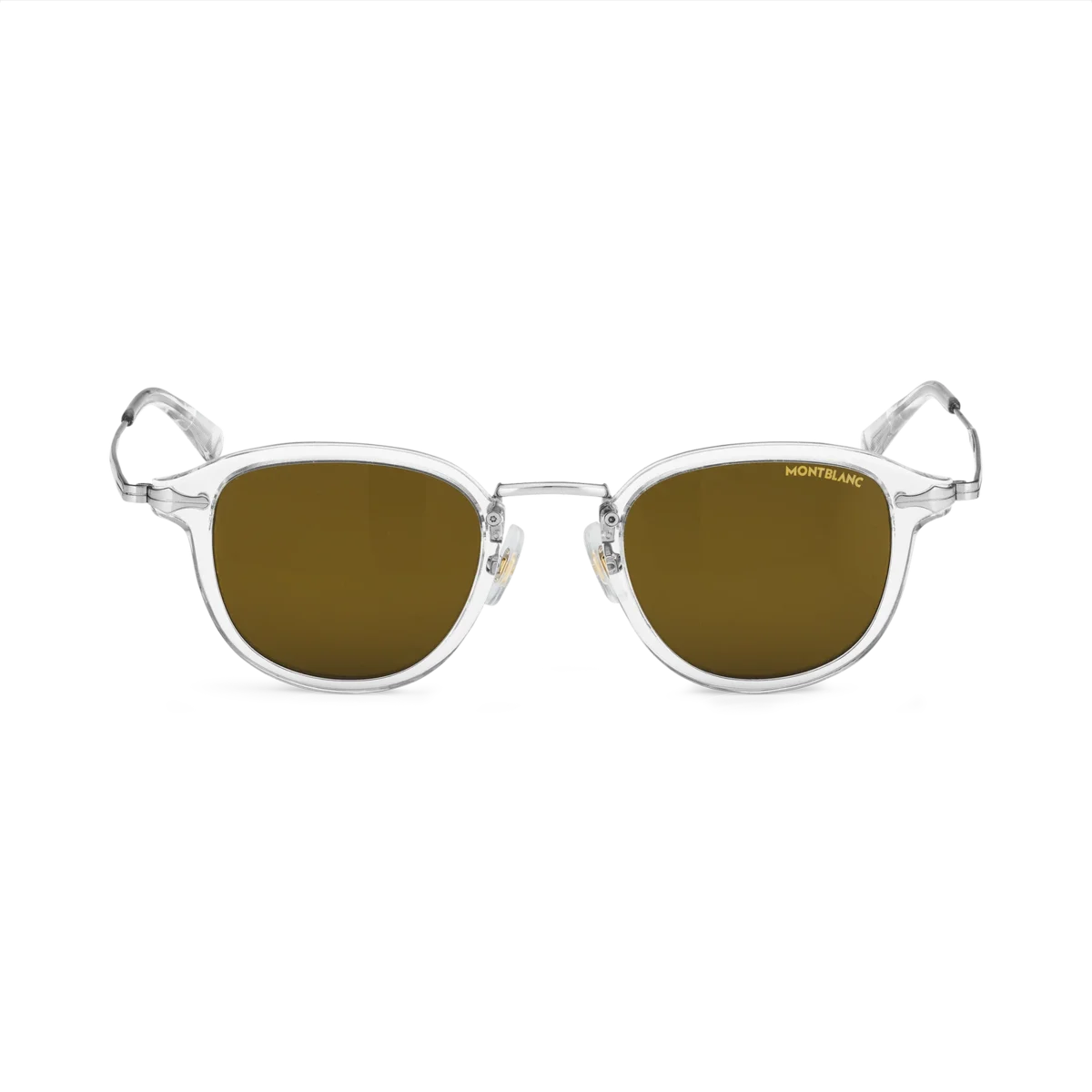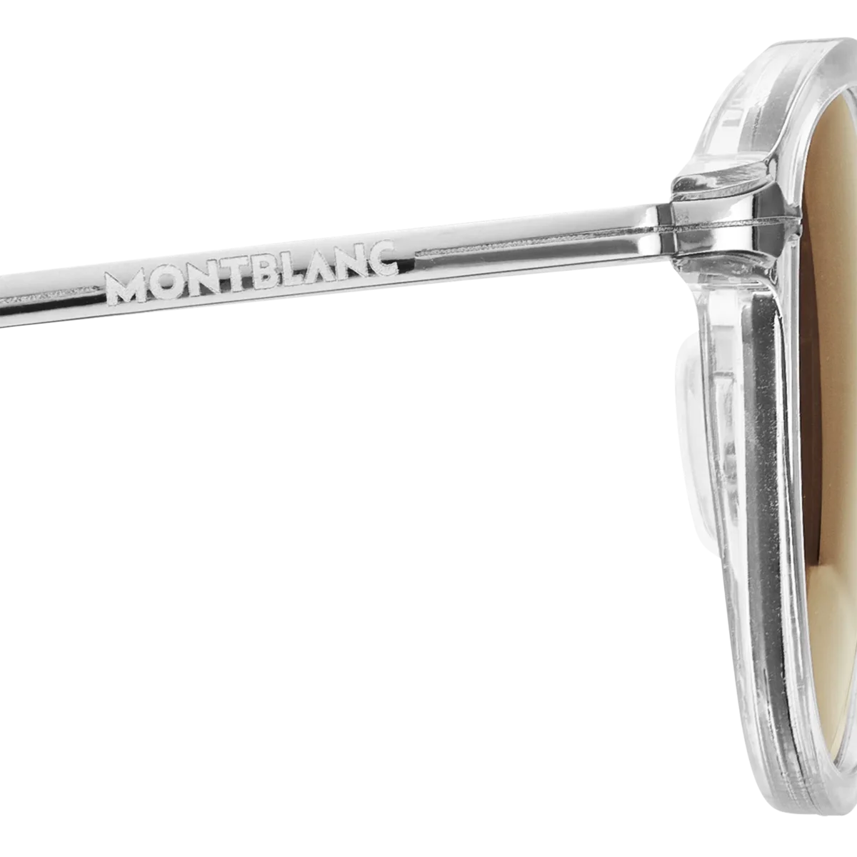 Estes óculos de sol redondos apresentam uma armação injetada cinzenta e lentes castanhas. Inspirado no design da ponta dos instrumentos de escrita, um detalhe decorativo da ponta é apresentado no design da haste metálica. O logótipo Montblanc está gravado a laser na lente esquerda e o padrão antiderrapante está gravado a laser no lado interno das pontas das hastes para aumentar o conforto.