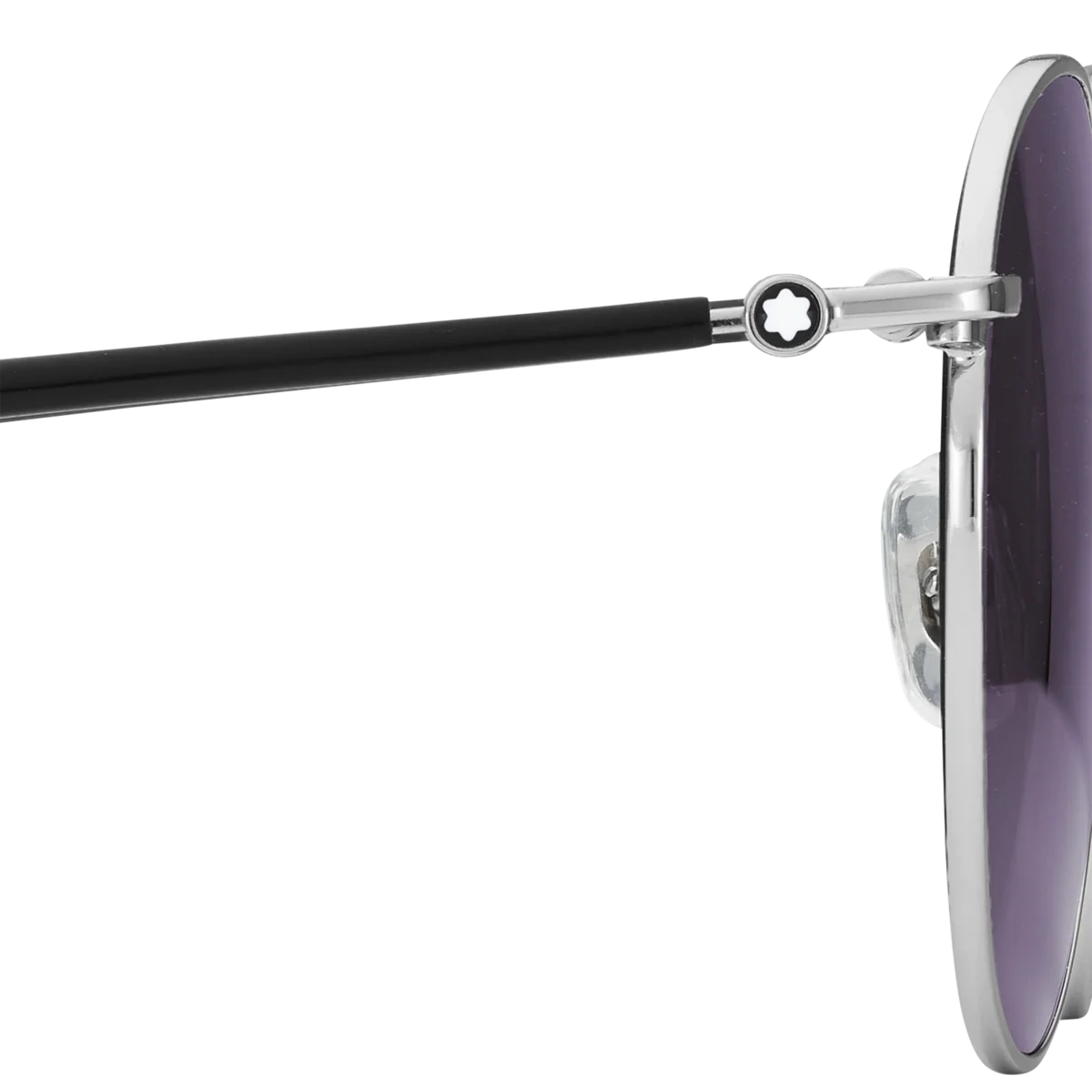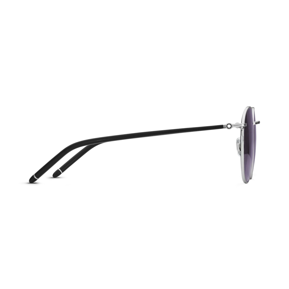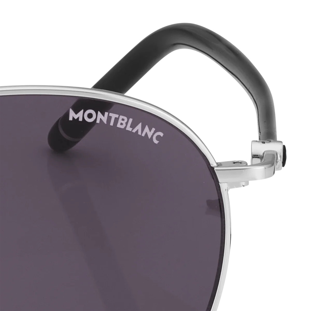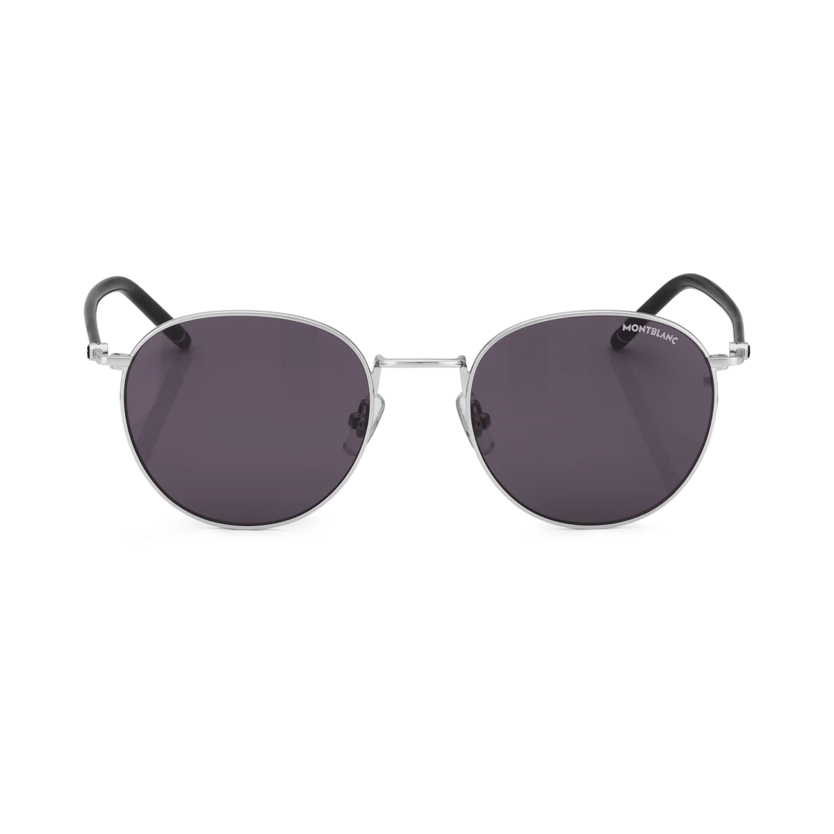 Estes óculos de sol redondos apresentam uma armação metálica prateada e lentes cinzentas. A haste tubular é inspirada nos instrumentos de escrita Meisterstück e enriquecida com um detalhe em esmalte preto nas pontas das hastes. O logótipo Montblanc está gravado a laser na lente esquerda e o logótipo da montanha nevada está incorporado na haste.