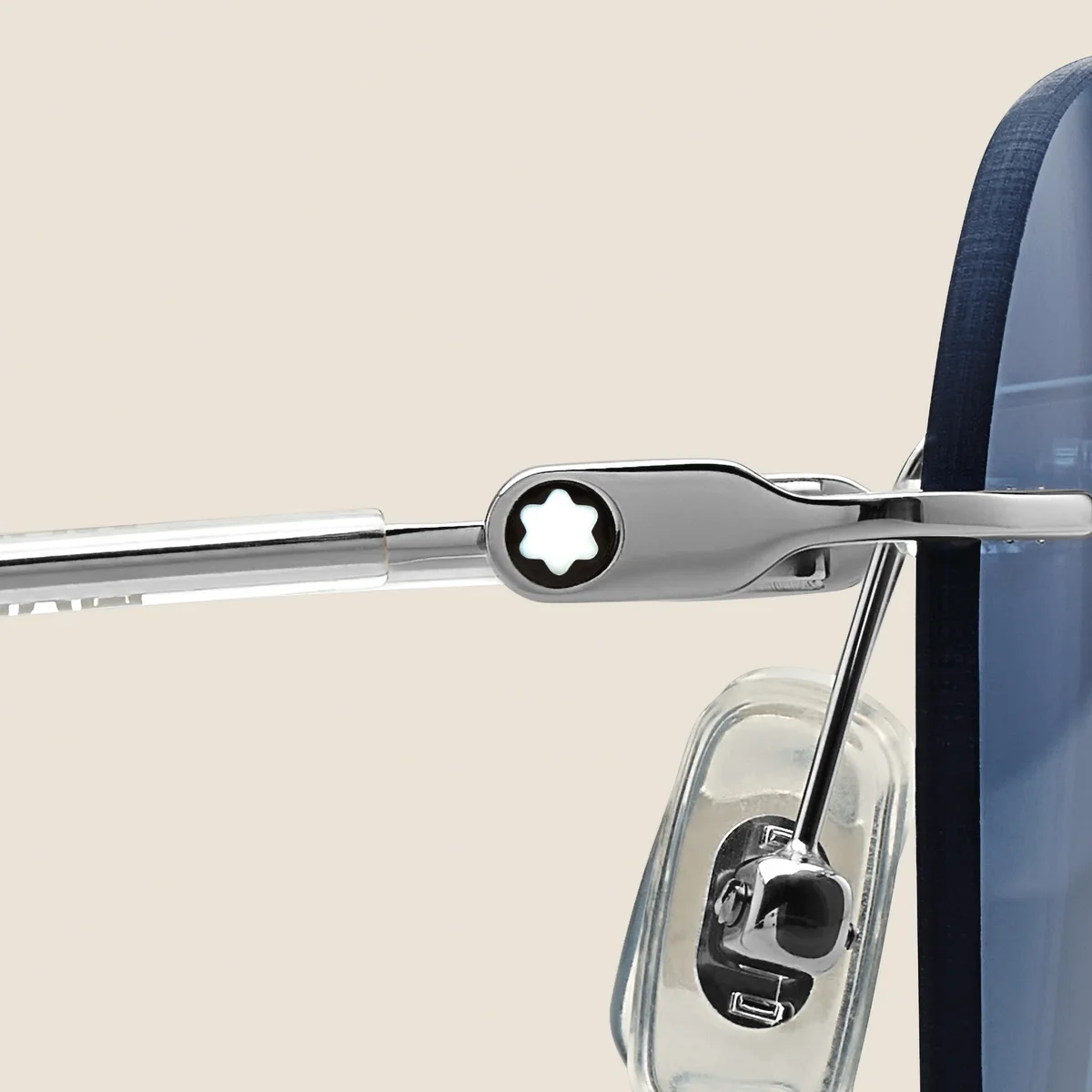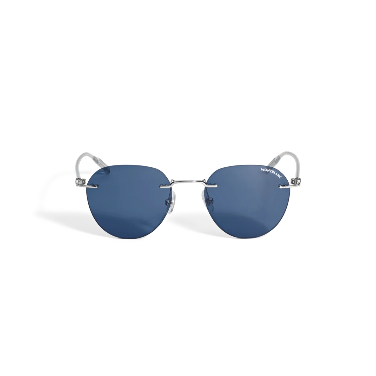 Estes óculos de sol sem aro, de estilo redondo, têm uma armação em metal prateado e lentes azuis. O emblema Montblanc está encapsulado no design das hastes. O logótipo Montblanc está gravado a laser na lente esquerda dos óculos de sol.