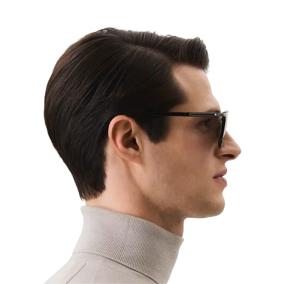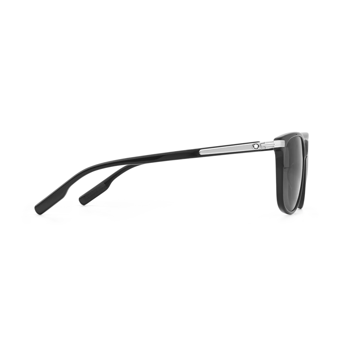 Estes óculos de sol de estilo retangular têm uma armação em acetato preto e lentes cinzentas. O detalhe do clipe é o elemento central do design das hastes, sendo tanto estético como funcional, pois permite pendurar a armação nos bolsos. O emblema Montblanc com capa de neve está encapsulado no detalhe do clipe da haste e o logótipo Montblanc está gravado a laser na lente esquerda.