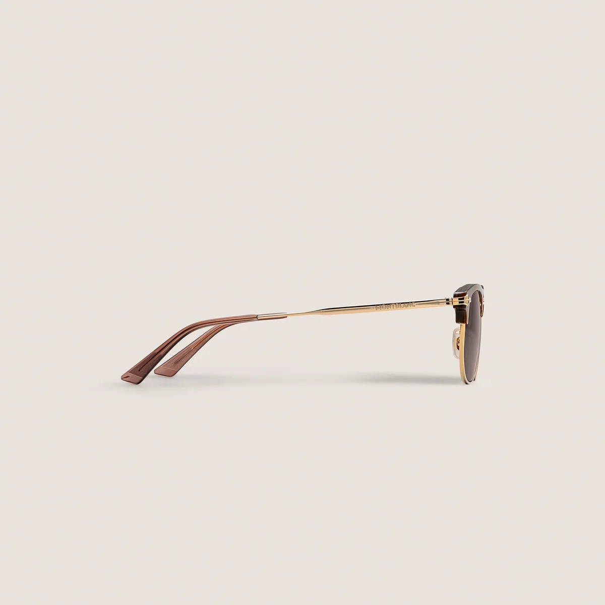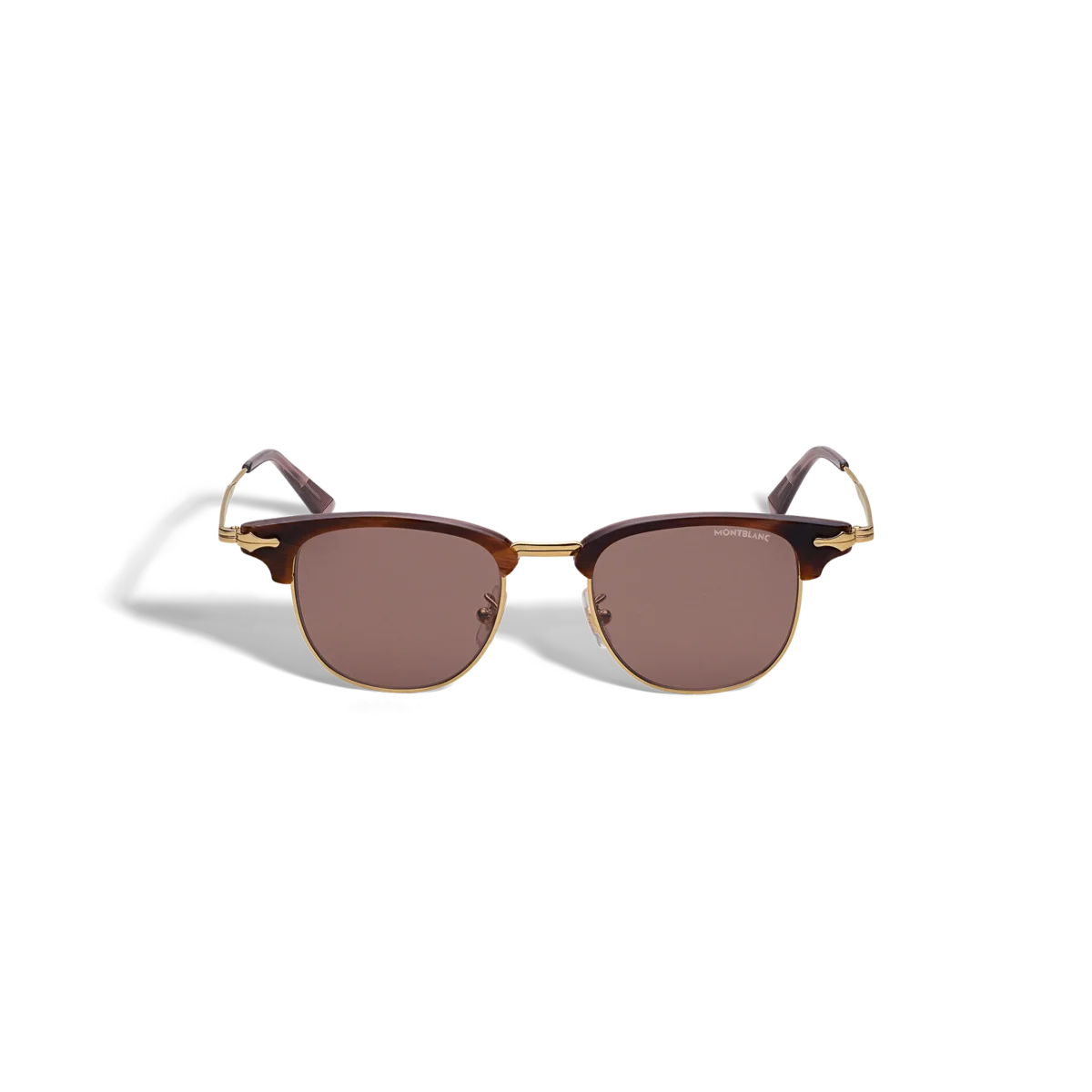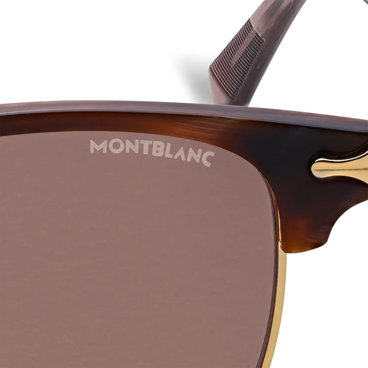 Estes óculos de sol de estilo retangular têm uma armação em metal dourado com lentes castanhas. Inspirado no design da ponta dos instrumentos de escrita, um detalhe decorativo em forma de ponta é apresentado no design da haste metálica. O logótipo Montblanc está gravado a laser na lente esquerda e o padrão antiderrapante está gravado a laser no lado interno das pontas das hastes para aumentar o conforto. Identificação n.º MB134462