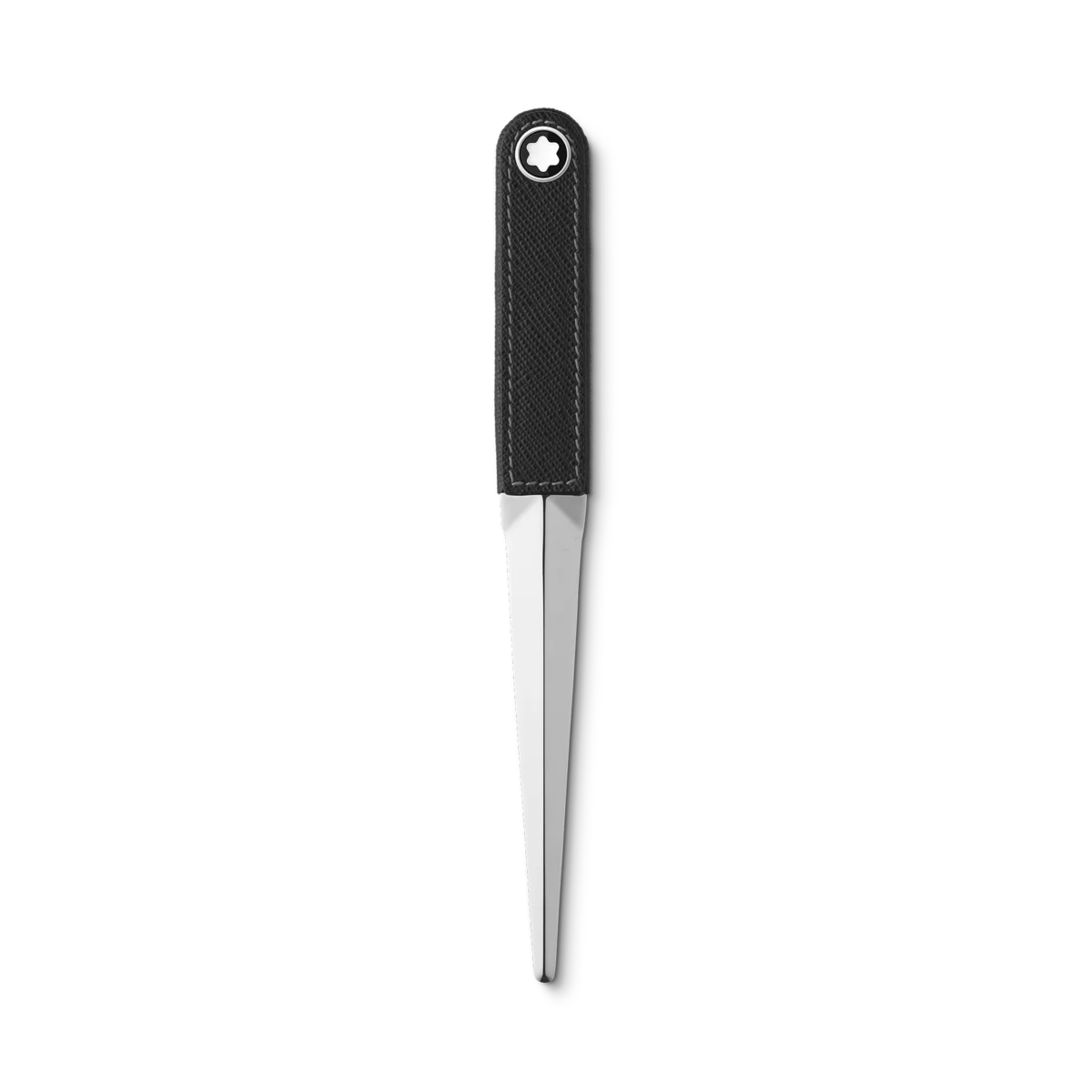 Abridor de cartas Montblanc em aço, banhado a ruténio com incrustação em couro macio preto.