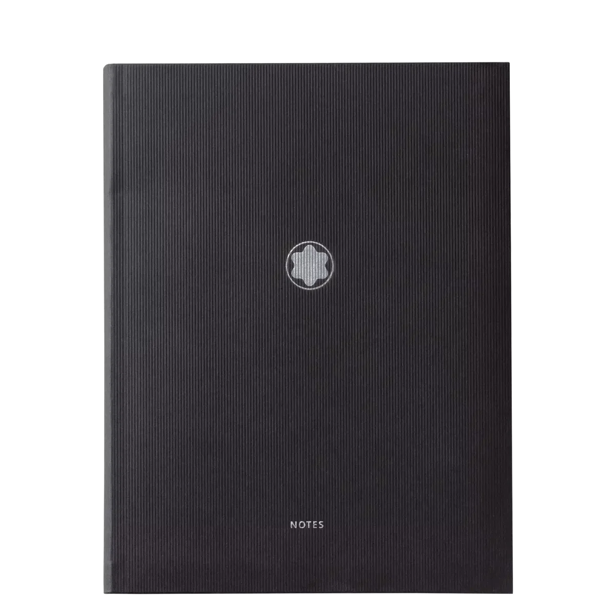 Bloco de notas médio com capa preta macia com o emblema Montblanc prateado centrado. A parte interna é composta por 248 páginas pautadas feitas de papel branco premium, perfeitamente adaptadas para escrever com tinta e exclusivamente marcadas com o emblema Montblanc