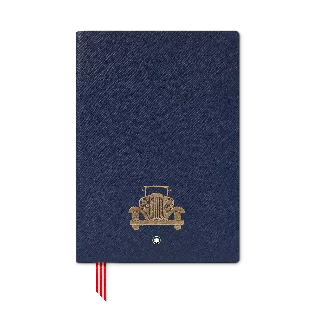 Caderno Montblanc #146 – Pequeno, Great Characters Homenagem a O Grande Gatsby, coleção em couro azul com estampa e padrão dourado de carros. Fabricado na Itália. 96 folhas / 192 páginas. Dimensões 150 x 210 mm.