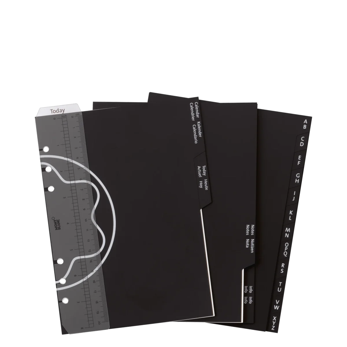Kit inicial grande. Conjunto de folhas divisórias, folhas em branco, folhas de endereços, mapa-múndi, códigos de discagem internacional, visão geral da boutique, régua e 2 pastas de plástico transparente para todos os organizadores Montblanc de tamanho grande.