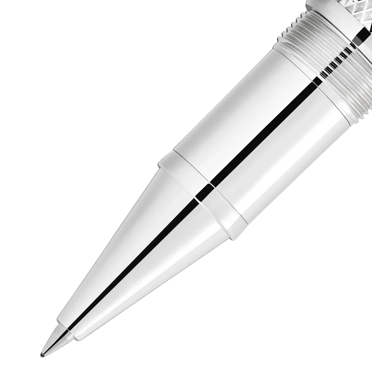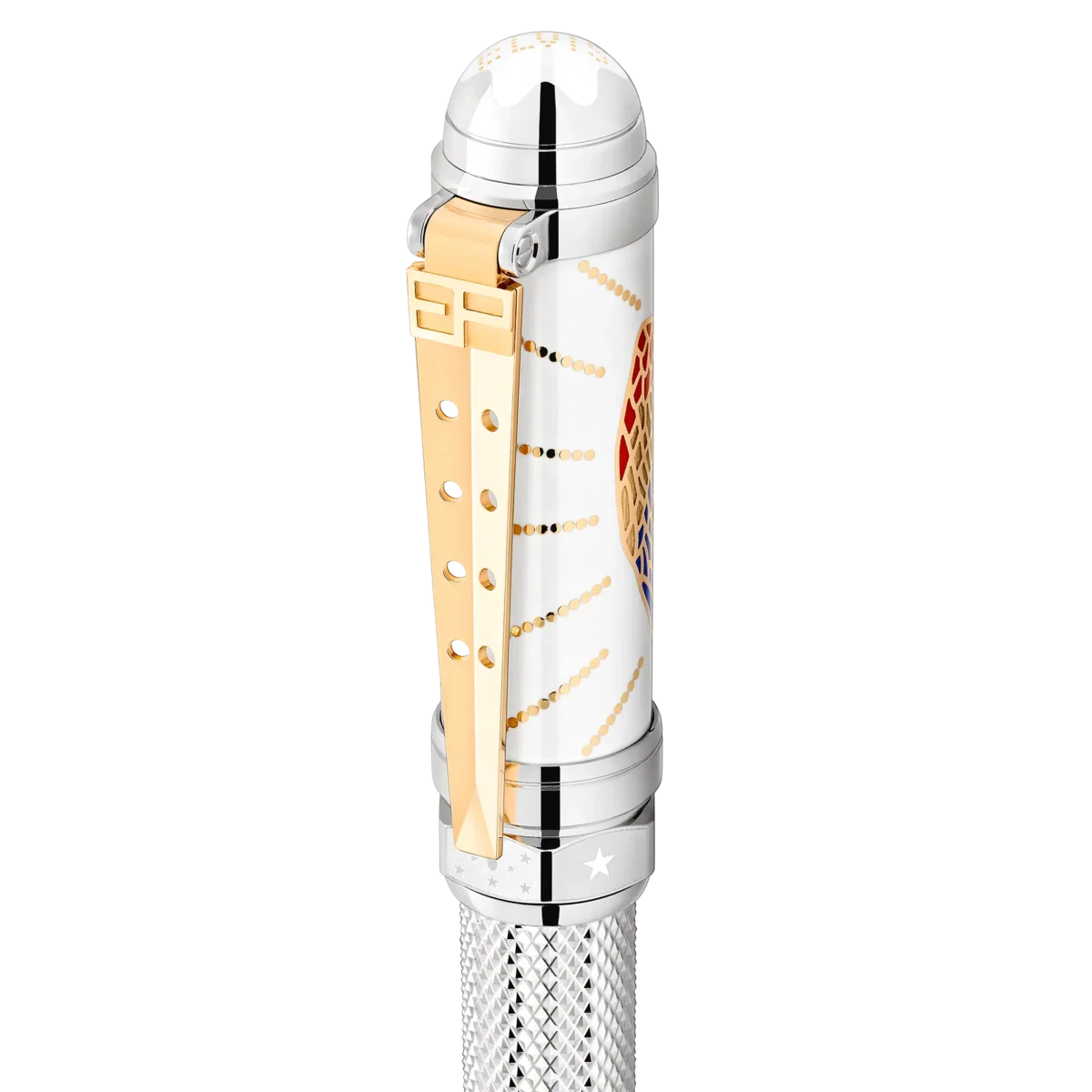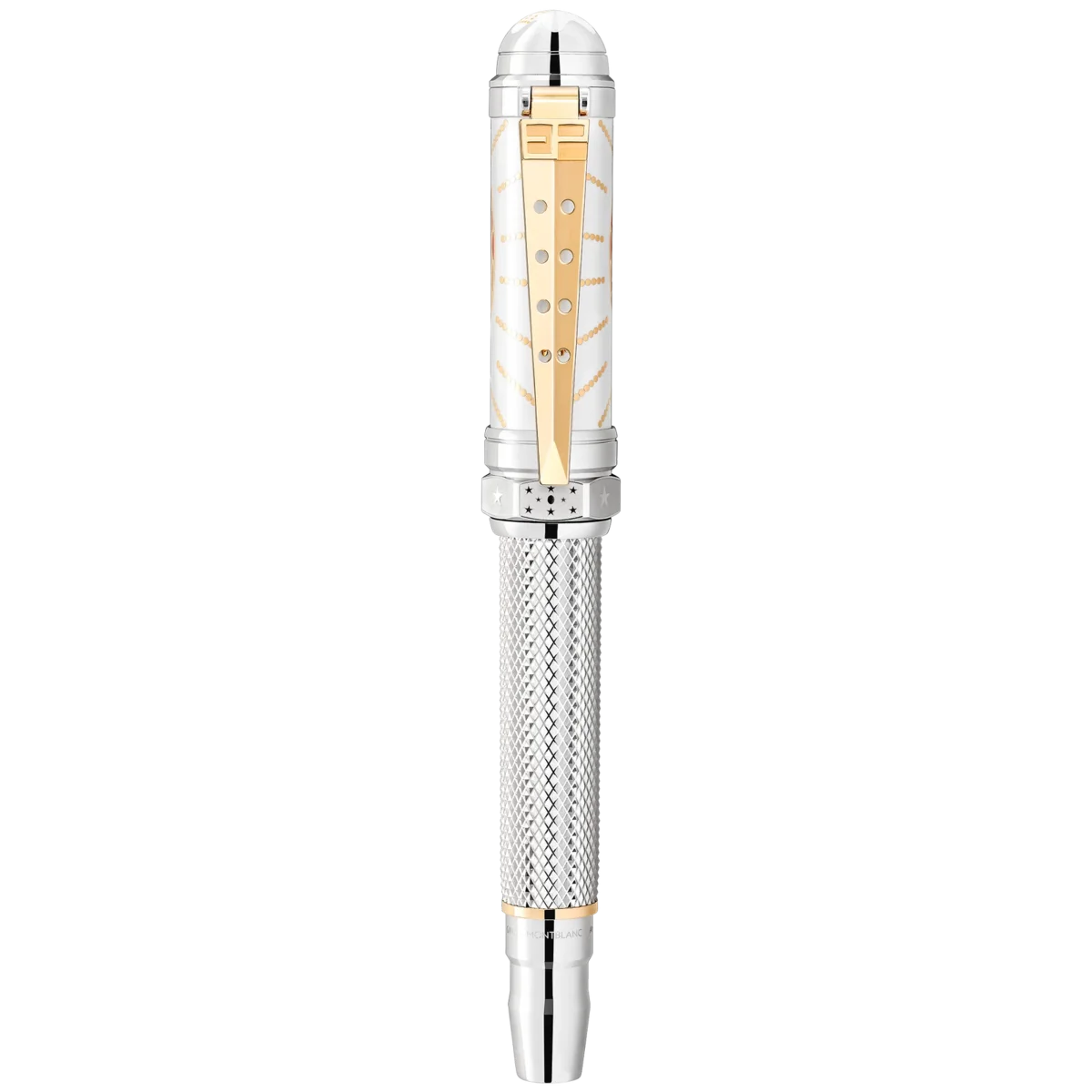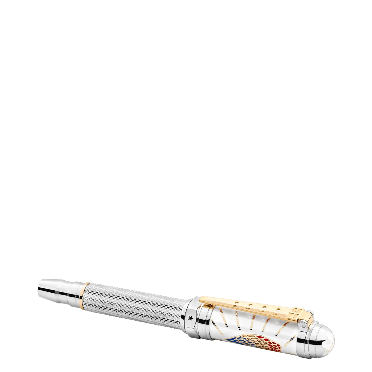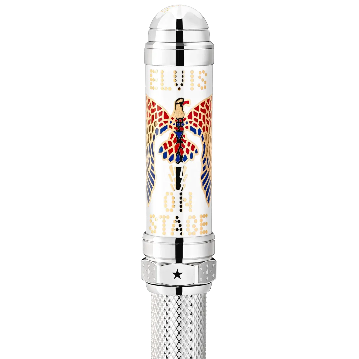 Elvis Presley ainda é considerado um dos ícones culturais mais importantes do século XX – o «Rei do Rock’n Roll» que marcou uma geração. Nascido em 1935, em Tupelo, Mississippi, e transferido para Memphis, Tennessee, Elvis Presley tornou-se um dos músicos mais famosos. A forma geral do instrumento de escrita é inspirada na vela de ignição de um motor de carro, inspirada no amor de Elvis pelos motores V8, bem como na forma do clipe revestido a ouro. O padrão na tampa e no corpo é inspirado no acabamento do anel de ouro que ele usou durante o concerto «Aloha from Hawaii». O clipe tem um formato em V, inspirado no amor de Elvis por Cadillacs e seus motores V8, e as letras «EP» em suas óculos escuros de estilo característico. Identificação n.º MB125508 Peso físico 94,24 g Dimensões 146,5 mm * 18,8 mm