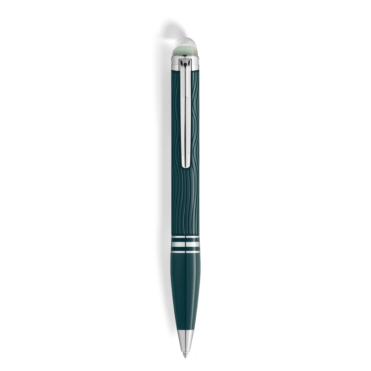 A StarWalker PolarGreen dá vida à beleza da aurora boreal. Na Terra, os seres humanos podem olhar para o céu e ser transportados para reinos maravilhosos ao testemunharem o seu grandioso espetáculo. A cúpula na parte superior da tampa é feita de resina transparente e brilha com pouca luz, lembrando as encantadoras auroras dançantes do céu noturno. O padrão ondulado na resina preciosa verde escura da tampa e do corpo capta admiravelmente o brilho espectral das luzes, e o acabamento mate acentua os reflexos adequados. Os anéis de resina verde escura da parte dianteira realçam os acessórios revestidos a platina da esferográfica. Identificação n.º MB132904 Peso físico 31,6 g Dimensões 134,5 mm * 13,1 mm