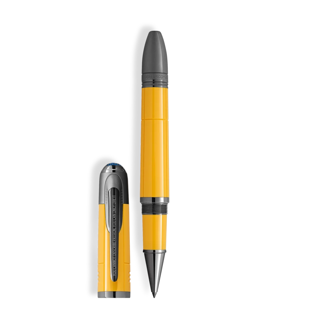 O nome Ferrari é sinónimo de design estético, motores potentes, inovação técnica quase infinita e um dos homens mais influentes da história do automóvel. Com uma visão enorme e uma paixão desenfreada pelo desporto motorizado, Enzo Ferrari levou a sua empresa a um prestígio sem paralelo e criou uma lenda que continua viva. A Montblanc dedicou a Montblanc Great Characters Enzo Ferrari Special Edition ao homem e à sua paixão pelas corridas. Inspirando-se tanto no brasão da cidade natal de Enzo Ferrari, Modena, como na cor emblemática do logótipo da Scuderia, esta edição homenageia a segunda alma da Ferrari: a cor amarela. As datas de nascimento de Enzo Ferrari e da sua primeira vitória nas corridas estão gravadas no cone, enquanto a sua assinatura e o nome da oficina do seu pai, «Officina Meccanica Alfredo Ferrari», em referência ao local de nascimento de Enzo Ferrari, estão gravados na parte superior da tampa. É coroada pelo emblema Montblanc em resina preciosa azul – como mais uma homenagem ao brasão de Modena – e rodeada por um intrincado trabalho em metal que lembra a grelha de um carro antigo. A primeira vitória de Enzo Ferrari, no Circuito del Savio, foi também a ocasião que marcou o início do agora famoso logótipo da Ferrari. Entre os muitos espectadores que admiraram a condução ousada de Enzo Ferrari naquele dia estava a família do piloto Francesco Baracca, que serviu durante a Primeira Guerra Mundial na mesma unidade que o irmão de Enzo, Dino. A mãe de Francesco Baracca, a condessa Paolina Biancoli, sugeriu que Enzo Ferrari usasse o emblema de um cavalo empinado e desenfreado do avião do seu filho nos seus carros de corrida para dar sorte. A associação do cavalo com a coragem e a vontade de dominar de um herói nacional tornou-o um símbolo ideal para Enzo. Nove anos depois, o Cavallino Rampante foi usado pela primeira vez num fundo amarelo para adornar um carro. Era 1932, na 24 Horas de Spa, e a equipa Scuderia Ferrari conquistou o 1.º e o 2.º lugares com dois carros com o Cavalo Empinado. O Cavallino Rampante está gravado na tampa da Montblanc Great Characters Enzo Ferrari Special Edition, juntamente com as palavras da condessa: «Le porterà fortuna» («Irá trazer-lhe sorte»). O primeiro carro fabricado pela Ferrari, o 125 S, com doze cilindros, saiu da fábrica em Maranello a 12 de março de 1947. Doze linhas gravadas simbolizam os doze cilindros. O lema de Enzo Ferrari, «Não se pode descrever a paixão, só se pode vivê-la», decora o clipe revestido a ruténio.