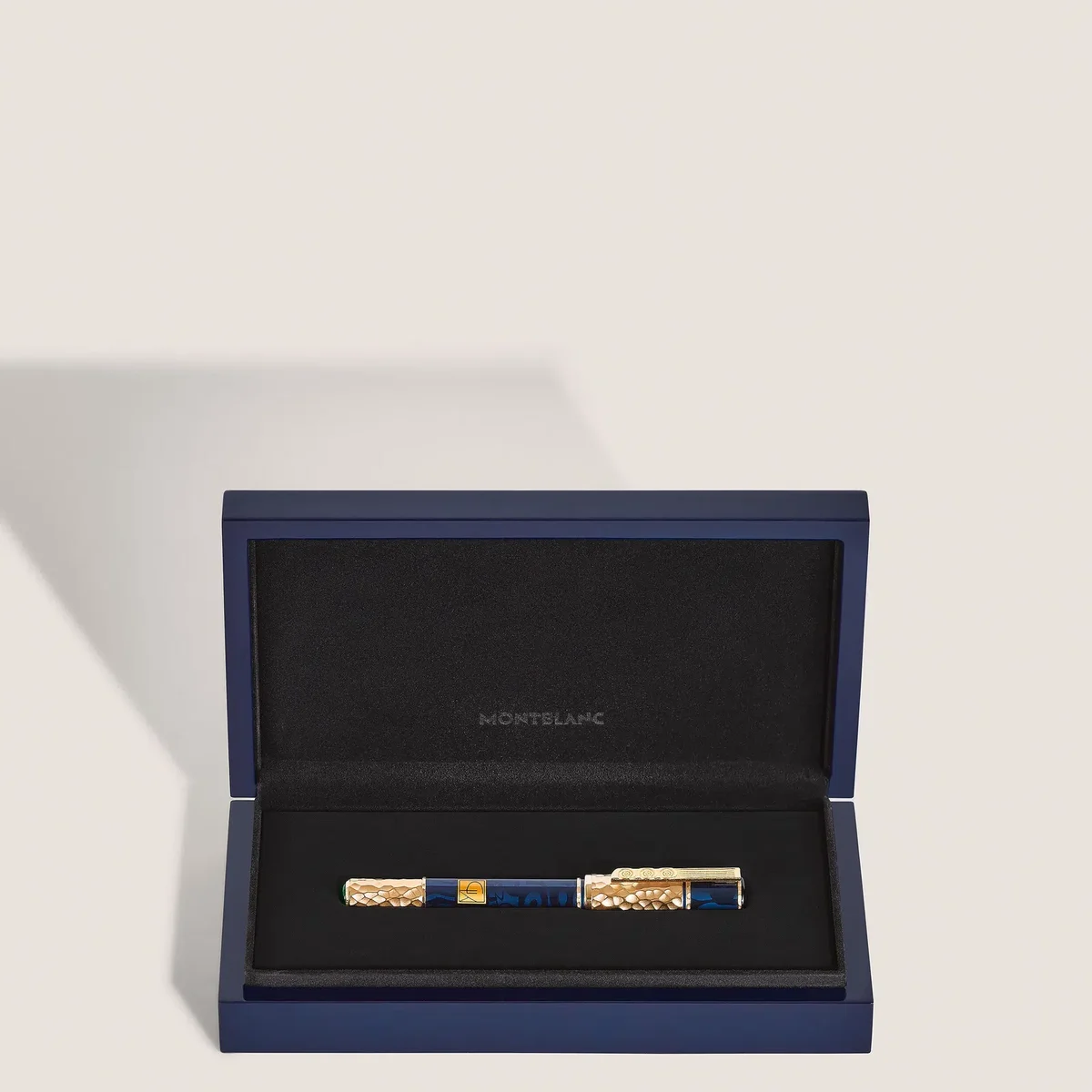Ao longo da história, grandes artistas expressaram a experiência humana numa linguagem universal de forma e beleza. A coleção Montblanc Masters of Art homenageia a sua contribuição eterna para a busca da perfeição na arte – uma busca que a Montblanc celebra e na qual participa. Um artista cuja visão ajudou a moldar a Art Nouveau vienense e a Idade de Ouro é Gustav Klimt. A Montblanc Masters of Art Homage to Gustav Klimt Limited Edition 4810 celebra os seus primórdios artísticos na Secessão de Viena e destaca elementos das suas obras-primas Pallas Athene e O Beijo no seu design. Na sua rebelião contra conceitos estereotipados na arte e na sociedade, Gustav Klimt foi um pioneiro da vanguarda. Ele fundiu representação realista, ornamentação e abstração num estilo que atingiu o seu auge nas suas pinturas de mulheres em grande escala, subtilmente sensuais. Uma das suas primeiras pinturas a dar igual valor ao ornamento e à modelo foi um retrato de 1902 da sua parceira e musa Emilie Flöge, retratada num azul sonhador, quase místico. Esta obra de arte inspirou o tom azul utilizado na Montblanc Masters of Art Homage to Gustav Klimt Limited Edition 4810. Os círculos, espirais, triângulos e linhas que brilham através da laca azul escura translúcida do instrumento de escrita provêm da sua famosa pintura O Beijo, na qual dois amantes parecem dissolver-se em formas ornamentais e geométricas através do poder da emoção. Compostos por laca azul translúcida e metal martelado revestido a ouro amarelo, a tampa e o corpo do instrumento de escrita fazem uso eficaz de cores complementares em referência às famosas obras da Fase Dourada de Gustav Klimt, incluindo Adele Bloch-Bauer I, o Friso Stoclet e O Beijo. Klimt utilizou uma nova técnica para enriquecer as suas cores com secções individuais de folha de ouro, criando a impressão de pedras preciosas incrustadas em ouro. Na Edição Limitada 4810, o cone martelado revestido a ouro amarelo é incrustado com uma espinélia verde sintética, cuja cor evoca a primavera, a estação dos novos começos. O monograma Secession de Klimt, uma impressão em tampão dourado das suas iniciais, GK, é uma homenagem às suas conquistas para a Secessão de Viena. O clipe da edição limitada 4810 em homenagem a Gustav Klimt foi especialmente concebido com referência à obra Pallas Athene, de Gustav Klimt. Como Atena é a deusa da guerra e das artes, ela é retratada iniciando a luta pela liberdade artística. As linhas ligeiramente curvas que terminam em três espirais no clipe revestido a ouro amarelo correspondem à decoração na estrutura de metal forjado. Identificação n.º MB130226 Peso físico 97,7 g Dimensões 146,9 mm * 17,6 mm