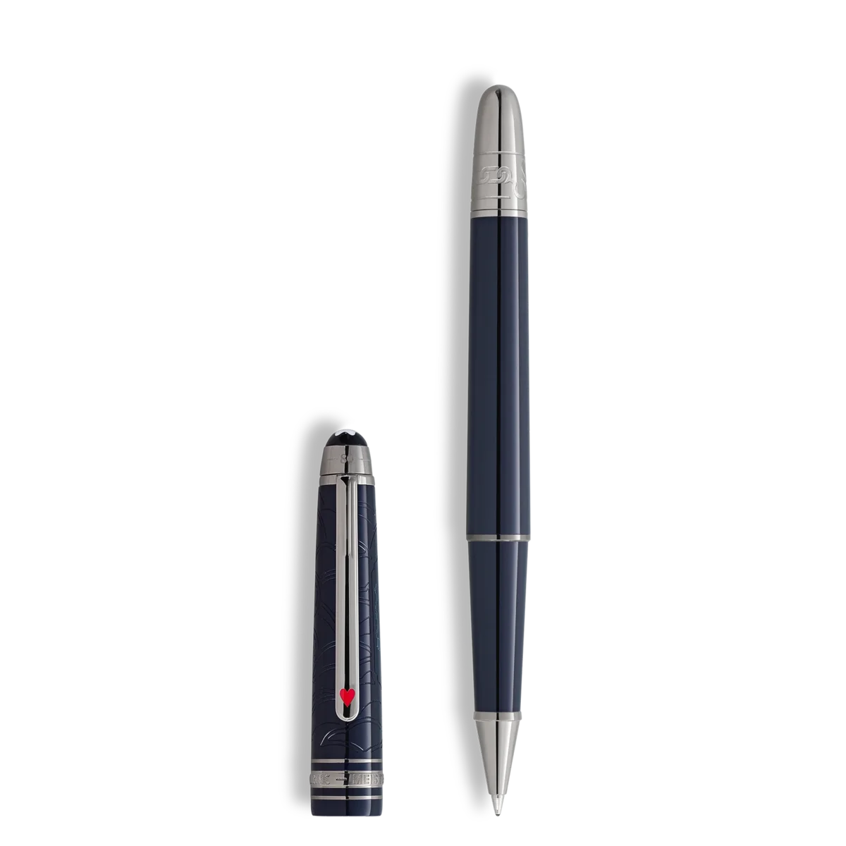 A coleção Meisterstück Around the World in 80 Days inspira-se no famoso romance de aventura de Júlio Verne. A esferográfica Classique, adornada com resina preciosa azul escura, reconta a viagem épica do Sr. Fogg e Passepartout. Embarcando na etapa final de Yokohama de volta a Londres, passando pelos Estados Unidos, a dupla atravessa o vasto continente americano de comboio. Mergulhe nos detalhes intricados – um comboio elegantemente gravado a laser na tampa, um padrão de corrente de segurança no cone, refletindo um momento crucial em que Passepartout separa o comboio da locomotiva para salvar a tripulação que foi atacada pelos Sioux.O design do boné captura as válvulas de pressão e a fumaça ondulante da locomotiva, enquanto o clipe exibe um naipe de copas vermelho lacado, simbolizando a união entre Phileas Fogg e a princesa Aouda. Além disso, os naipes representam a ousada aposta de Fogg de completar a viagem em apenas 80 dias. A parte superior do boné apresenta a linha do tempo da viagem em relevo – 36 dias de Yokohama a Londres, culminando no total de 80 dias ao redor do mundo.