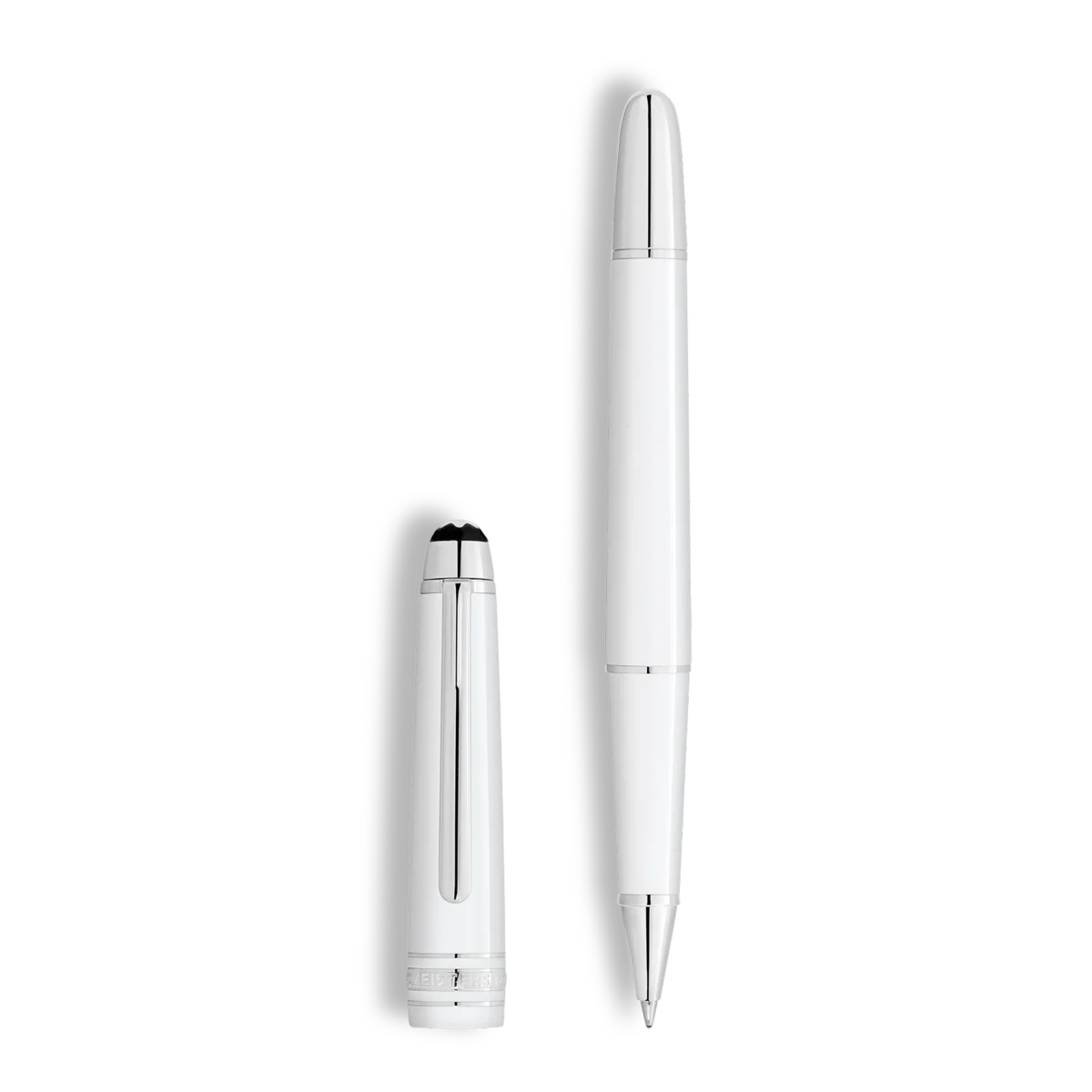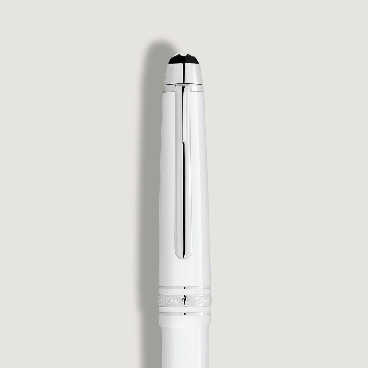 A Meisterstück Classique Rollerball em resina preciosa branca com elegantes acessórios revestidos a platina, encimada pelo emblema Montblanc branco incrustado na parte superior da tampa, evolui para um ícone de design distinto.
