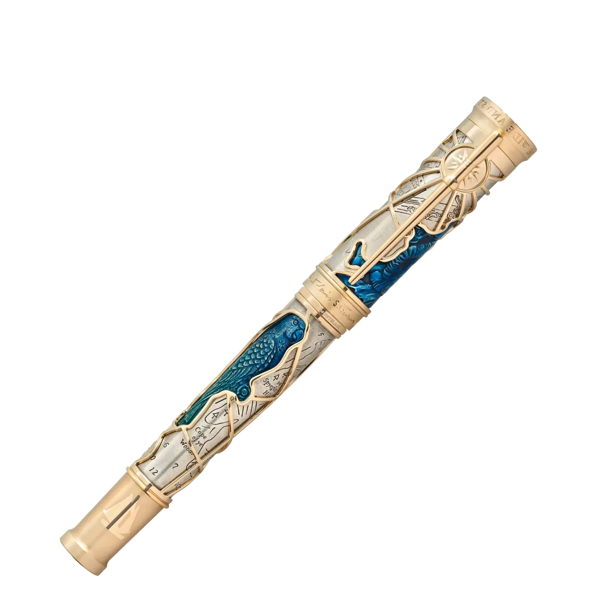 Robert Louis Stevenson, nascido em Edimburgo, na Escócia, em 1850, tinha dois grandes desejos: liberdade e imersão em outros mundos. Ele escreveu ensaios e relatos de viagem, bem como suas lendárias histórias de aventura repletas de personagens marcantes, cujos nomes causam arrepios nos leitores de todo o mundo: Long John Silver, Capitão Flint, Jekyll e Hyde. A Montblanc Writers Edition Homage to Robert Louis Stevenson é dedicada a este contador de histórias imaginativo. O romance «A Ilha do Tesouro» inspirou muitos detalhes do design desta edição. A forma geral do instrumento de escrita e os anéis no cone dão a impressão de uma luneta histórica extensível. Uma das figuras mais perigosas a bordo do Hispaniola é Long John Silver, que está imortalizado na tampa como uma figura gravada à mão e preenchida com laca. O fiel papagaio de Long John Silver, Capitão Flint, também está incorporado na grade como uma figura gravada à mão e coberta com laca degradê. Em torno do anel superior da tampa está a primeira linha do réquiem que Stevenson escreveu para si mesmo: «UNDER THE WIDE AND STARRY SKY» (Sob o céu vasto e estrelado). As letras estão invertidas e remetem para o tema da dualidade no romance de Stevenson «O Estranho Caso do Dr. Jekyll e Mr. Hyde». O clipe revestido a ouro amarelo imita a forma de um pino de amarração ao qual o cordame é preso num navio como o Hispaniola. Atrás do clipe, bem como no corpo desta edição, uma rosa dos ventos estilizada é trabalhada na grade sólida de ouro amarelo Au 750. O mapa do tesouro desenhado à mão por Stevenson, que é o ponto de partida e o centro de todo o romance, está gravado no corpo em prata esterlina Ag 925. A ponta é composta por dois elementos: a palavra «Tusitala» — um nome dado a Stevenson pelos samoanos, que se traduz como «contador de histórias» — e folhas de palmeira que representam a chegada de Stevenson a Samoa, a sua amada ilha do Pacífico.