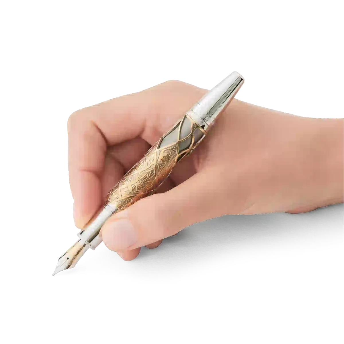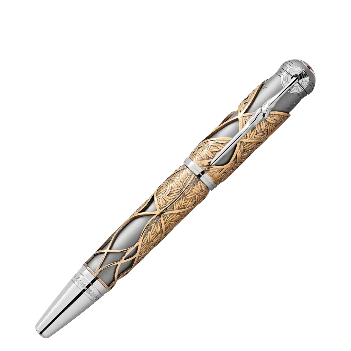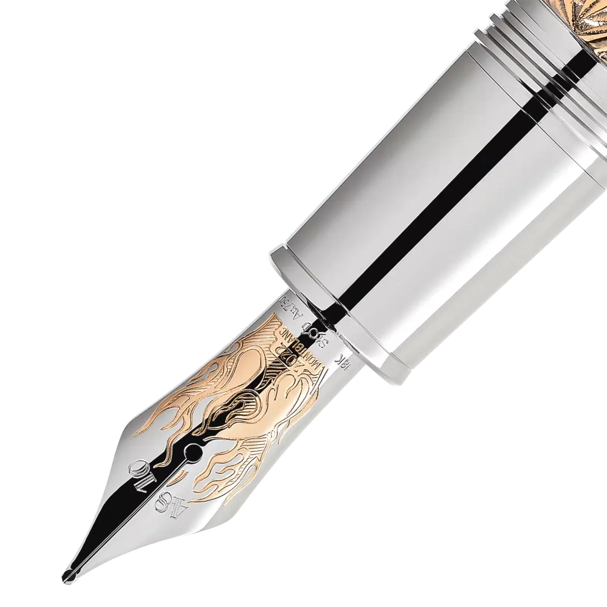 «Era uma vez…» A Montblanc Writers Edition Homage to the Brothers Grimm é dedicada a Jacob e Wilhelm Grimm e celebra o seu trabalho com contos populares alemães e europeus, entre os quais se encontram alguns dos contos de fadas mais famosos, como «Branca de Neve», «Cinderela» e «A Bela Adormecida». A silhueta geral do instrumento de escrita tem a forma de um antigo bastão de caminhada. Feita de metal com um revestimento vintage especial, esta edição inspira-se na história da «Bela Adormecida», representada pelas folhas e espinhos entrelaçados à volta da tampa e do corpo. A tampa é coroada pelo emblema Montblanc em madrepérola preciosa. O clipe revestido a platina, que lembra um pedaço de madeira nodoso, revela surpreendentemente a silhueta do perfil dos irmãos Grimm quando virado. Em homenagem à magia da narrativa, a ponta artesanal em ouro maciço bicolor Au 750 com revestimento de ródio ostenta as chamas de uma fogueira, que era frequentemente o cenário onde as histórias folclóricas eram transmitidas.