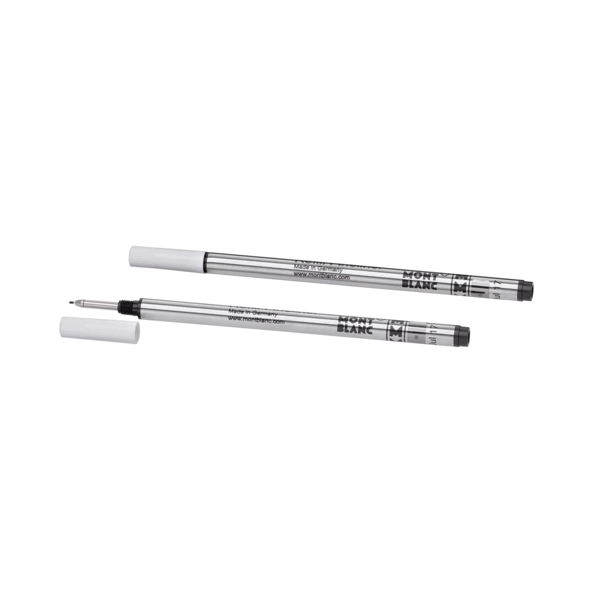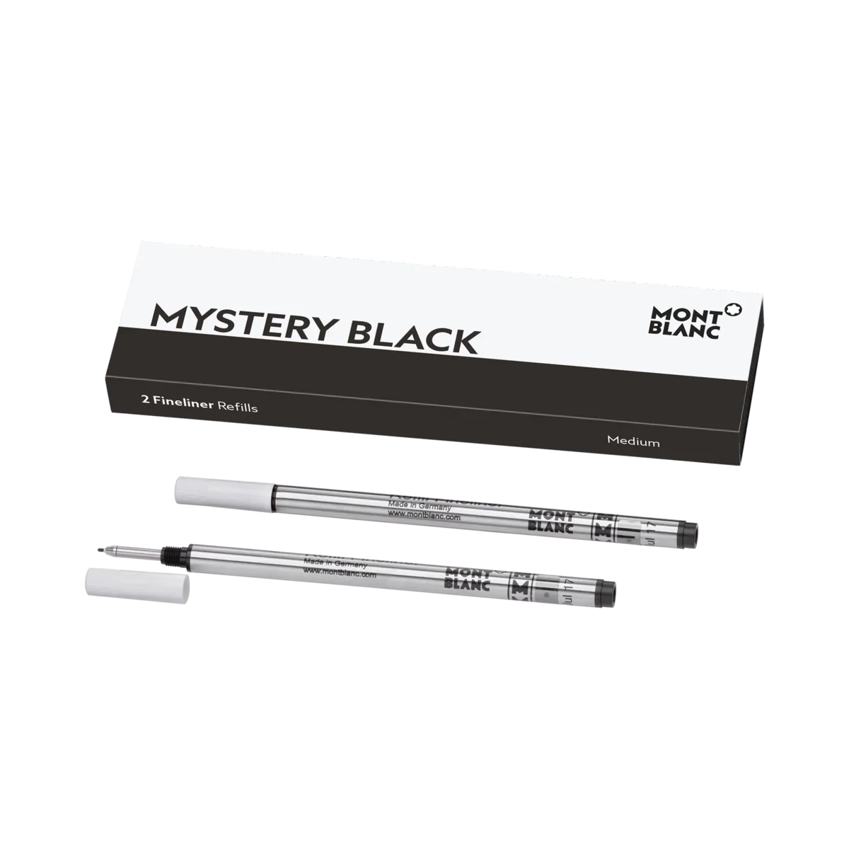 Recargas para caneta de ponta fina Montblanc, Mystery Black. Adequadas para todas as canetas de ponta fina/rollerball Montblanc, exceto Meisterstück LeGrand, Montblanc M e rollerballs sem tampa da coleção Heritage. Unidades de embalagem = 2 recargas. M = Médio