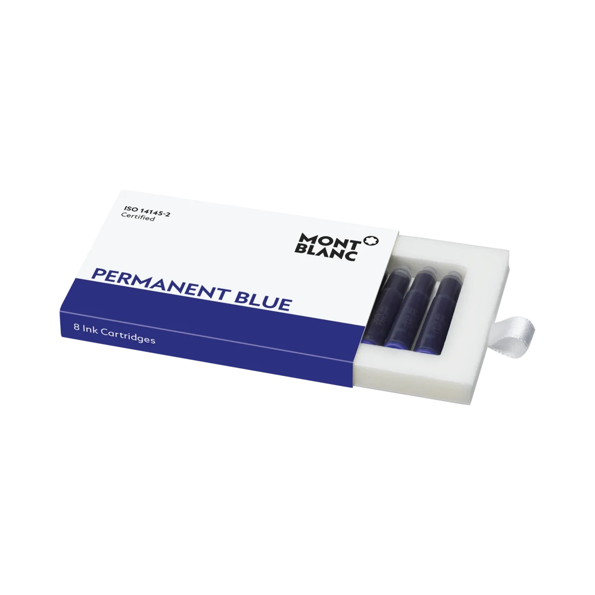 Adequado para todas as canetas-tinteiro Montblanc com sistema de cartucho. As tintas permanentes Montblanc, «Permanent Black» e «Permanent Blue», são testadas de acordo com a norma DIN ISO 14145-2 e são adequadas para uso documental. Unidades de embalagem = 8 cartuchos