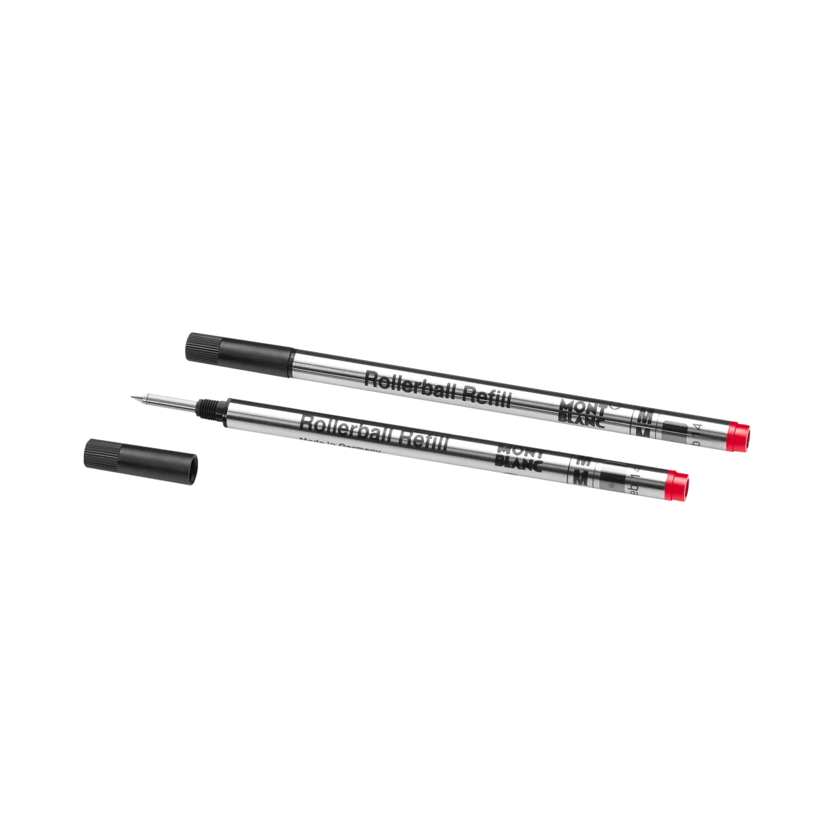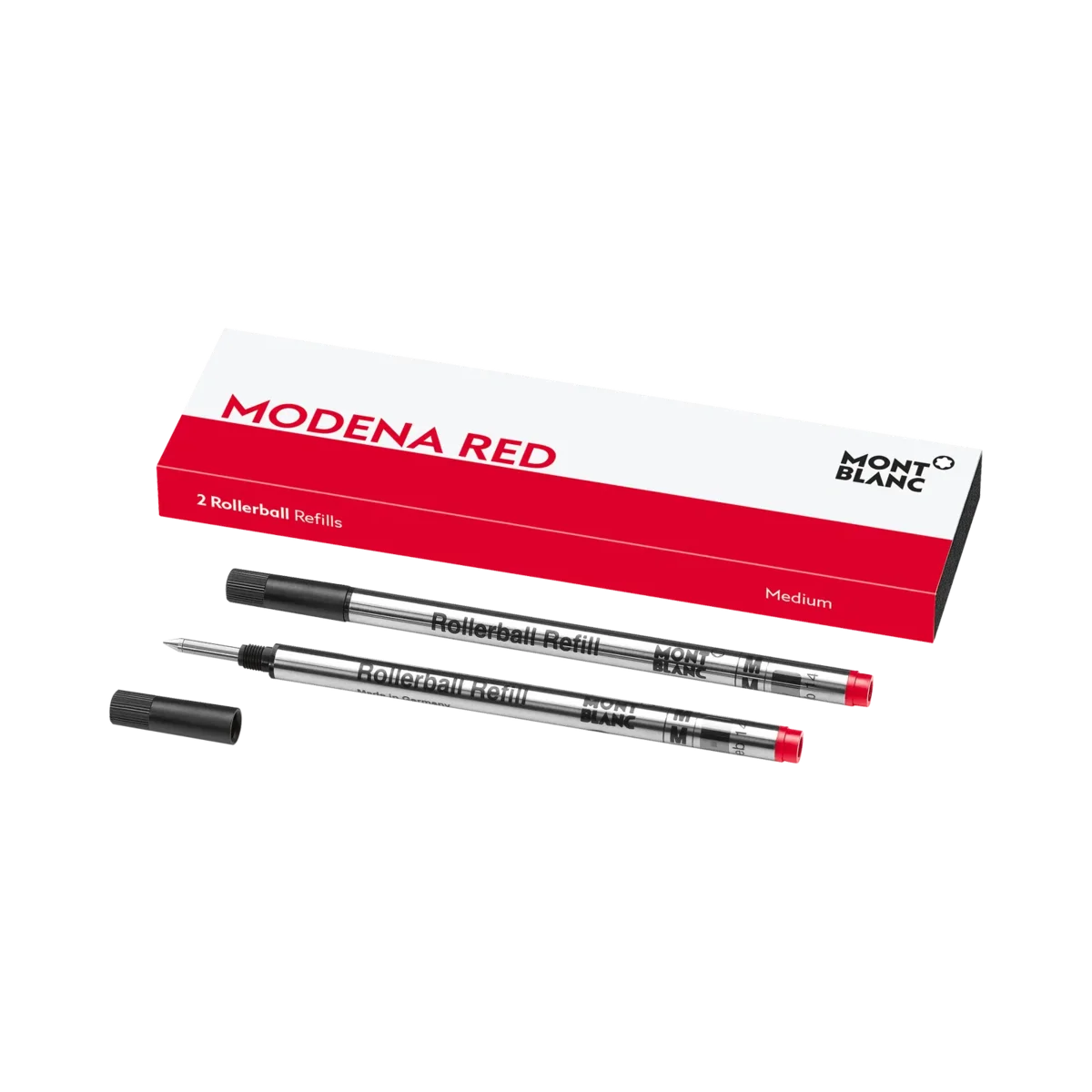 Recargas para rollerball Montblanc, vermelho Modena. Adequadas para todas as canetas rollerball/fineliner Montblanc, exceto Meisterstück LeGrand, Montblanc M e rollerballs sem tampa da coleção Heritage. Unidades de embalagem = 2 recargas. M = Médio