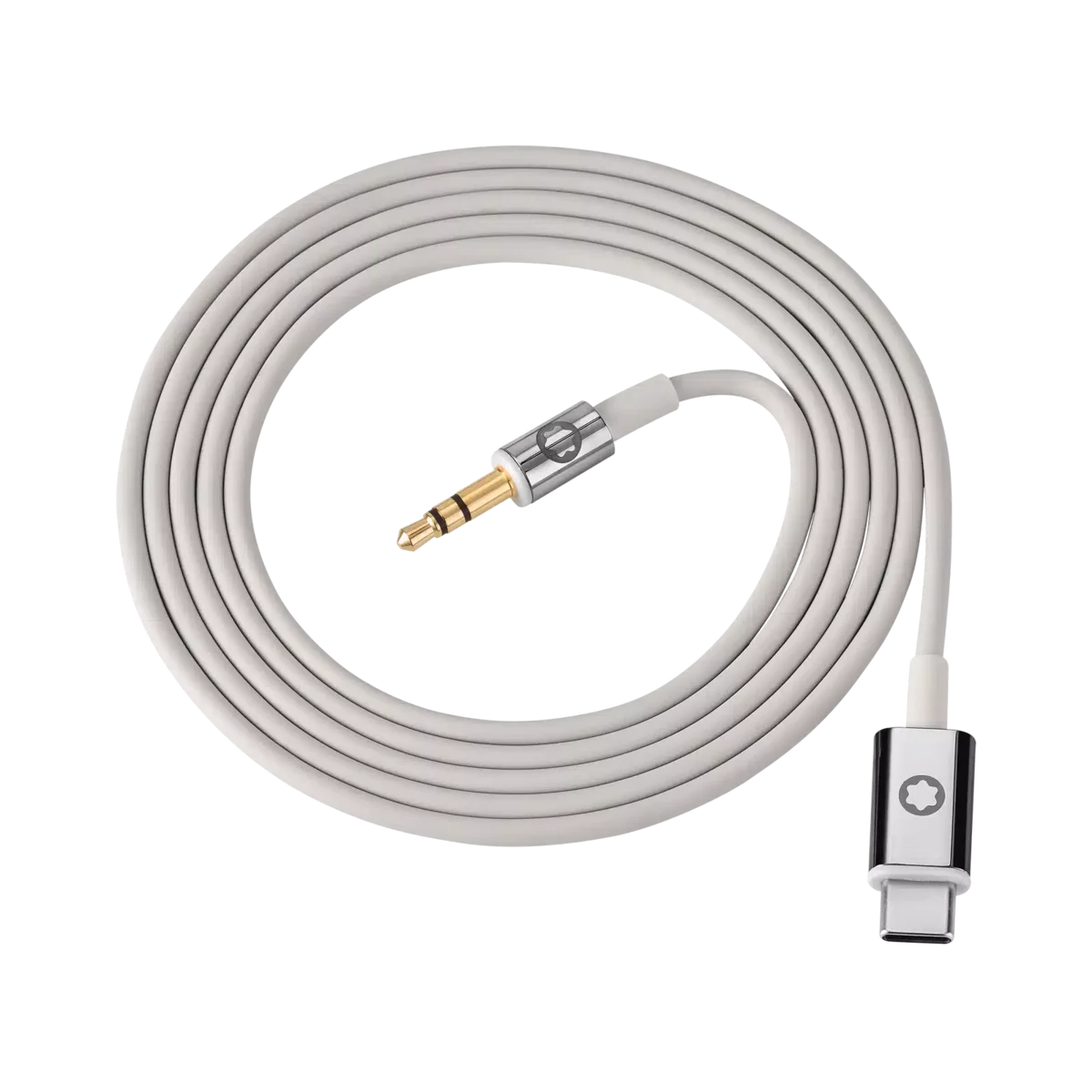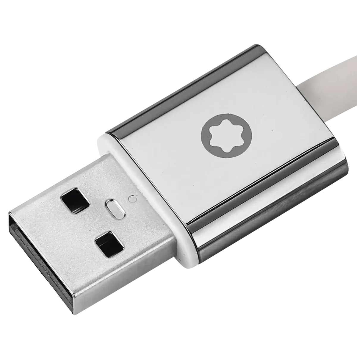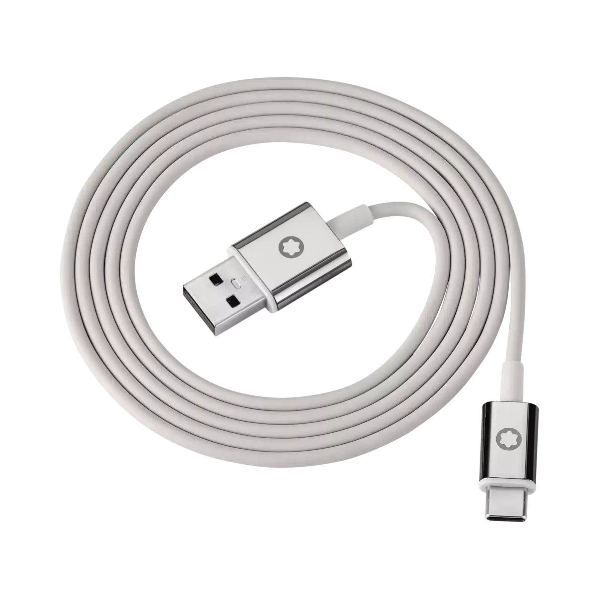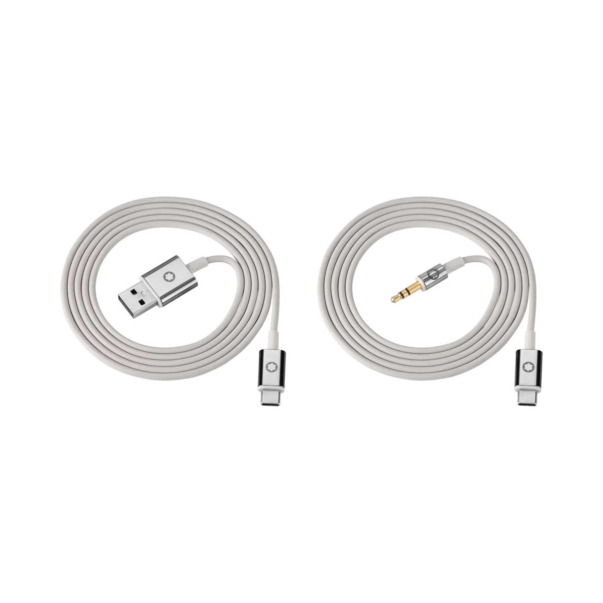 Conjunto de cabos extra para os seus auscultadores Montblanc MB 01, contendo um cabo de carregamento USB-C cinzento e um cabo de áudio cinzento.