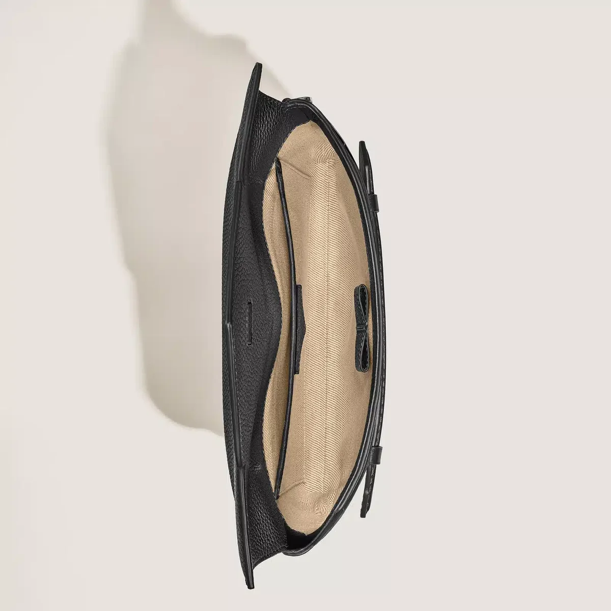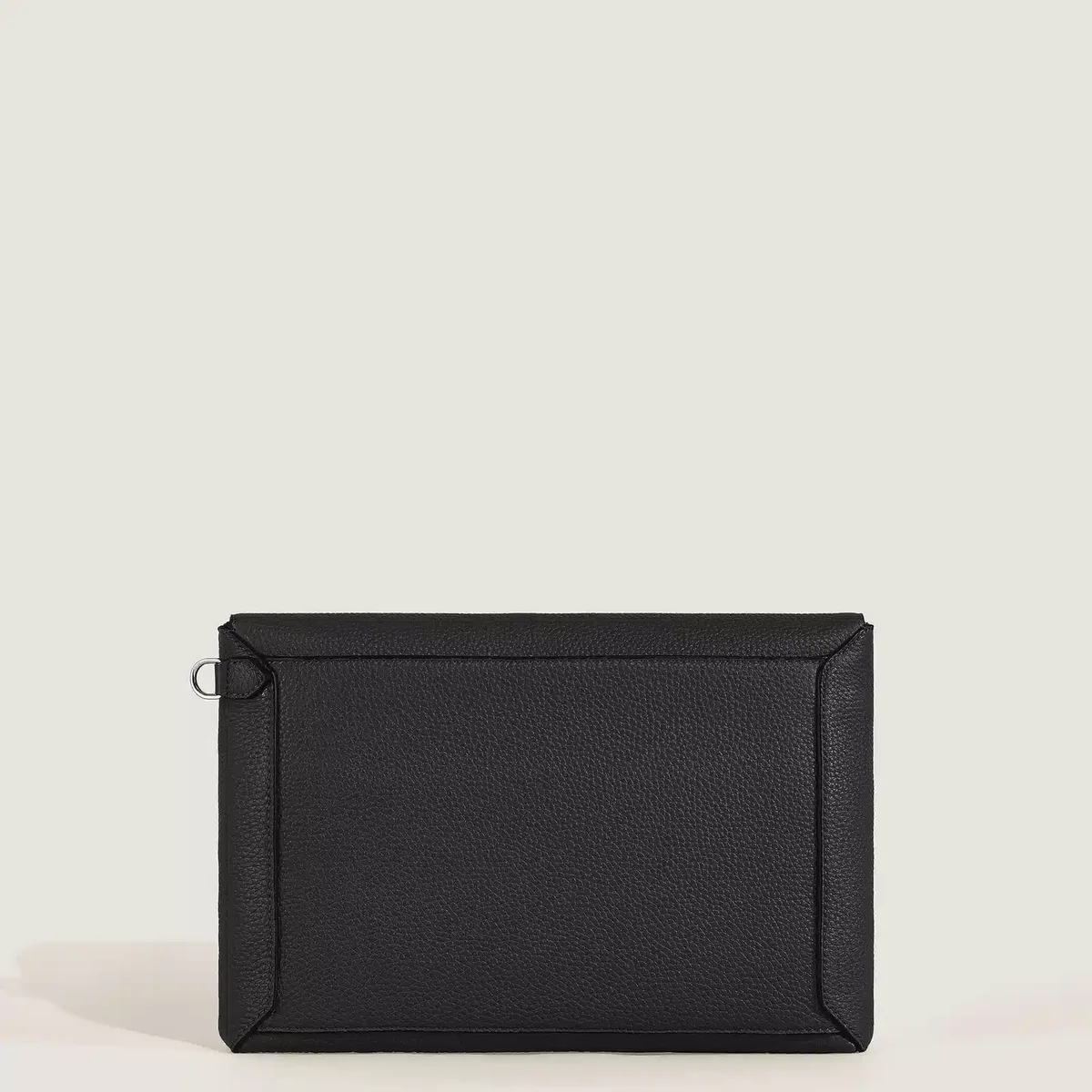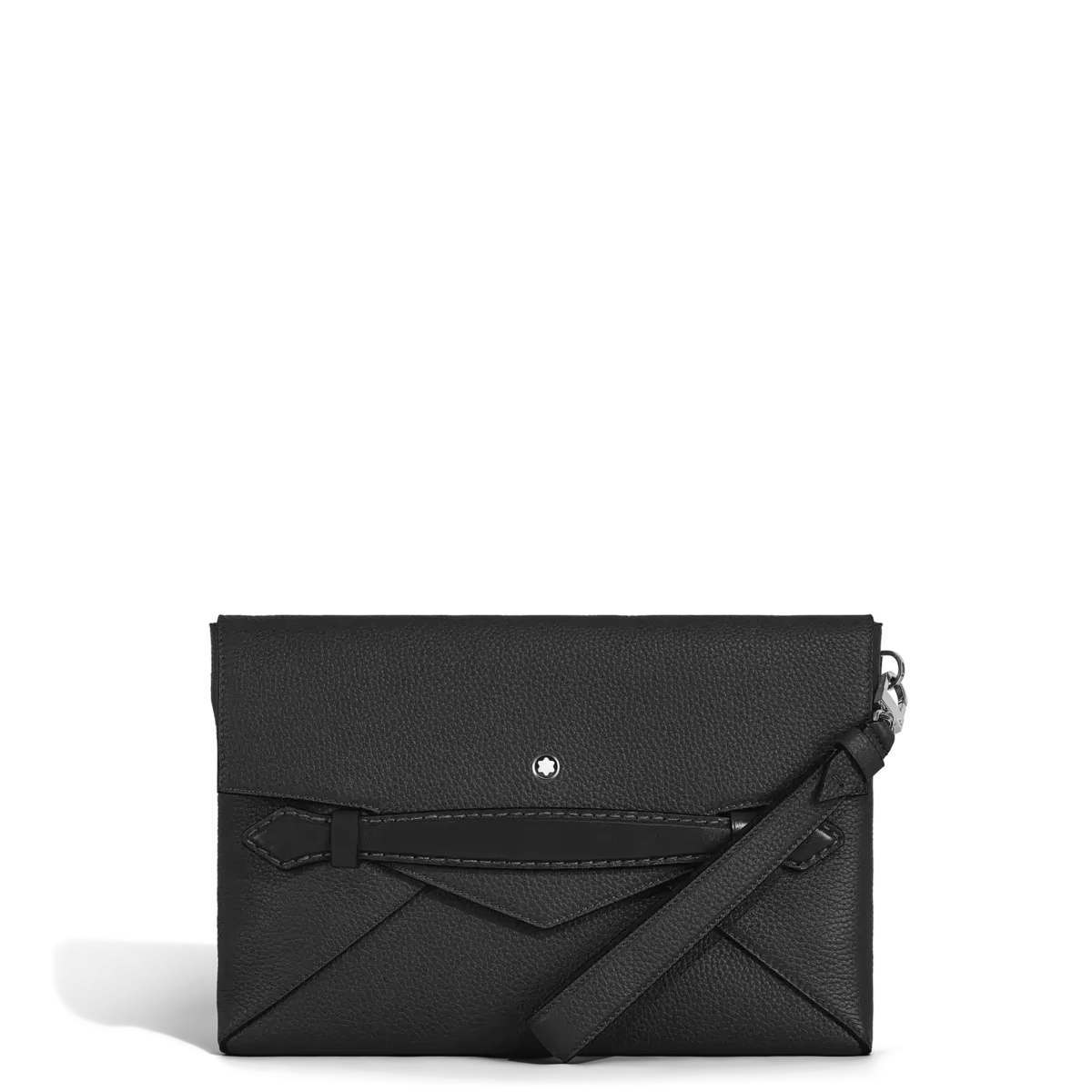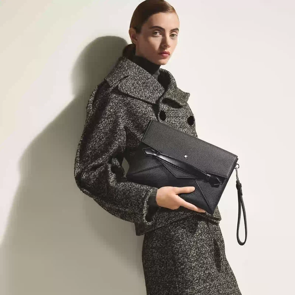 Esta clutch combina a escrita da Montblanc com uma funcionalidade refinada. O seu design inspirado num envelope é confecionado em pele preta flexível com grão, apresentando costuras em sela que ecoam o movimento de uma caneta a traçar uma linha pontilhada. A pega frontal exclusiva em forma de ponta de caneta oferece uma forma confortável de segurar a bolsa com uma mão, enquanto uma pega de pulso destacável acrescenta versatilidade. No interior, inclui um compartimento principal, um bolso aberto e duas presilhas para instrumentos de escrita, complementados por um bolso traseiro para maior praticidade. Identificação n.º MB220212