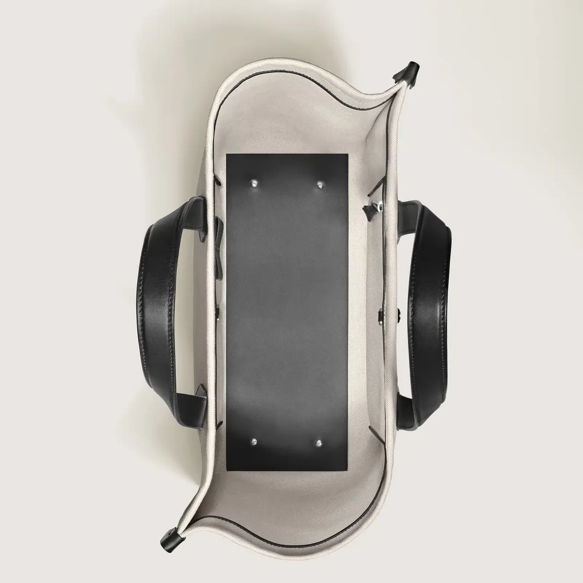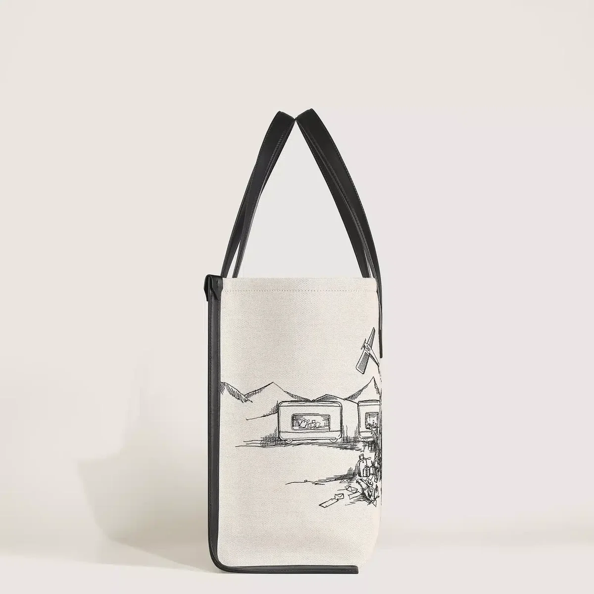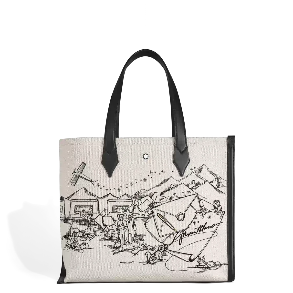 A bolsa exclusiva Happy Holidays é uma celebração das viagens festivas, uma verdadeira ode à viagem da escrita. Apoiada por luxuosas alças em pele de bezerro em forma de ponta de caneta, o corpo da bolsa é confecionado em lona, com um padrão bordado à mão que cobre toda a parte da frente da bolsa. Sobre o Mont Blanc, o padrão retrata elementos dos arquivos da Montblanc, a icónica Meisterstück, papéis e envelopes em espiral. Espaçosa e funcional, a bolsa possui um bolso com fecho, dois bolsos abertos e duas presilhas para canetas para uma organização fácil.