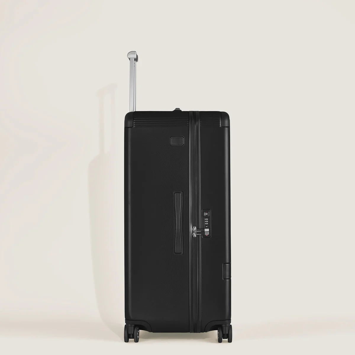 Descubra a série de malas com rodas #MY4810 e a sua mais recente adição: uma mala de grande capacidade com um novo formato, fabricada em policarbonato preto leve combinado com acabamentos refinados em couro preto. Deslize sem esforço com 4 rodas silenciosas com rolamentos de esferas, extensões de barra estáveis com comprimento ajustável e sistema multi-stop e pegas confortáveis em couro. No interior, desfrute de um compartimento espaçoso para roupas com alça ajustável de um lado e uma rede preta do outro, fecho com zíper e bolso para cartões de visita. Torne a sua mala única com uma etiqueta de bagagem e uma etiqueta de personalização em três cores.